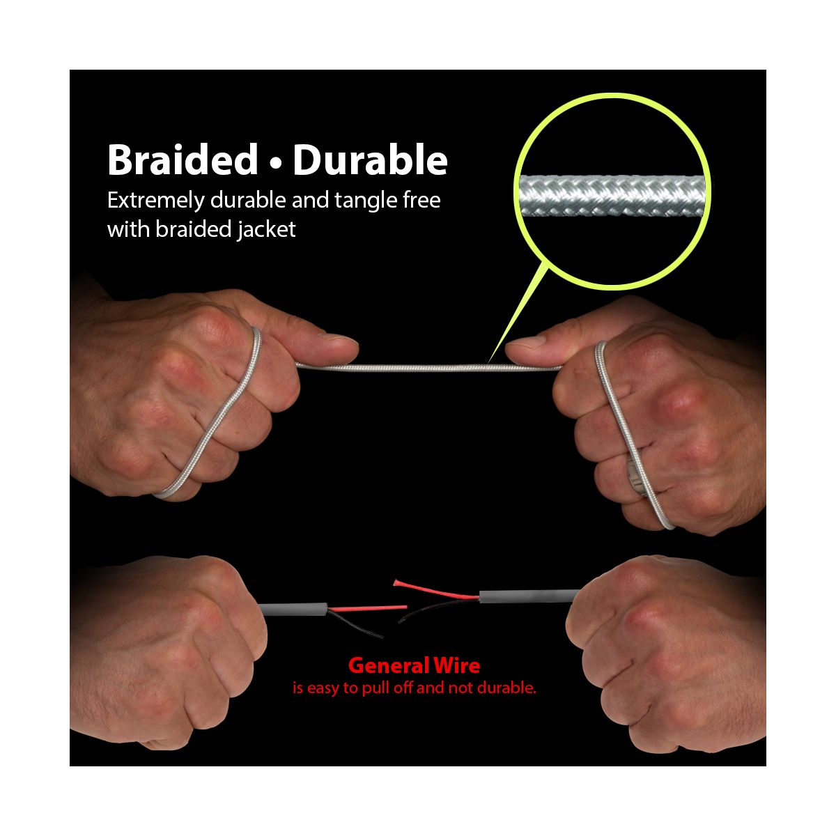 The Fabric Braided Jacket provides extra cable durability and protects it from damage. Tangle-free and tear resistant helps it perform in top shape.