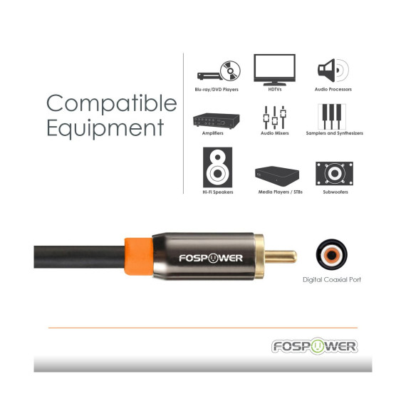 FosPower's premium Digital Audio Coaxial Cable allows you to connect your Blu-ray/DVD player, HDTV, media player, set-top box, or any other audio device with a coaxial audio port to your audio processor, amplifier, audio mixer, sampler, synthesizer, speakers, or subwoofer through the S/PDIF interface.