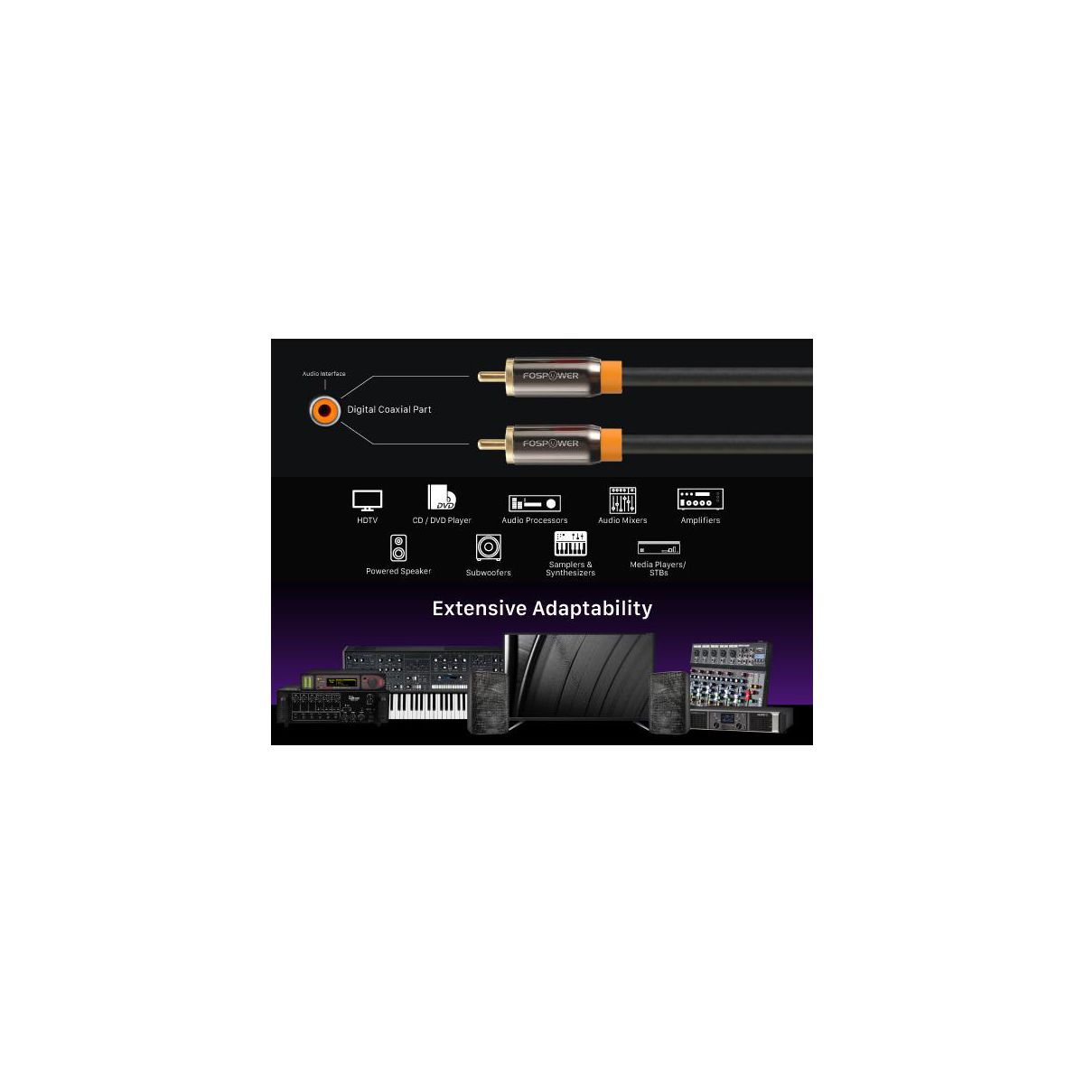 FosPower's premium Digital Audio Coaxial Cable allows you to connect your Blu-ray/DVD player, HDTV, media player, set-top box, or any other audio device with a coaxial audio port to your audio processor, amplifier, audio mixer, sampler, synthesizer, speakers, or subwoofer through the S/PDIF interface.