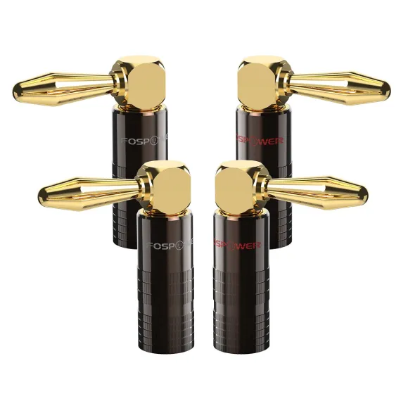 Introducing FosPower's Right-Angled Speaker Banana Plugs – perfect for compact spaces and challenging angles. These plugs retain the simplicity of installation while featuring a new, space-saving right-angled design. They're perfect for use with speakers, A/V receivers, amplifiers, surround sound systems, and banana wall plates that use banana-style binding posts. The new design simplifies the process of connecting speaker wire to your amplifiers/receivers and speakers, even in tight corners.