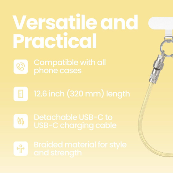 The GEMS Universal Phone Wristlet USB-C Cable keeps your phone close and ready to charge in one clever design. This 2-in-1 accessory works as a secure wristlet and a detachable USB-C to USB-C charging cable, so you always have power within reach. The universal connector card slips easily into any phone case, while the 12-inch braided nylon cable adds both durability and a modern look. Whether you’re traveling, commuting, or running errands, the GEMS Universal Phone Wristlet USB-C Cable helps you stay organized and connected wherever you go.