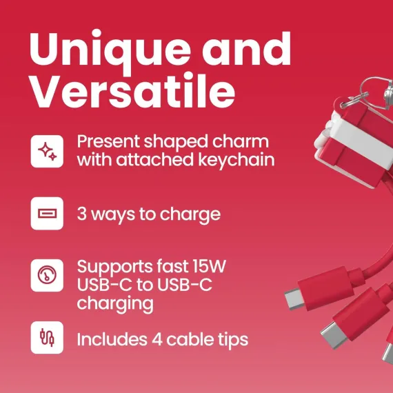 The GEMS Figural Keychain Cable is a festive and practical way to keep your devices powered wherever you are. This 3-in-1 charging cable includes four handy tips so you can connect USB-A, Micro USB, and USB-C devices with ease. It supports fast 60W USB-C to USB-C charging for speedy power-ups when you need them most. This cute and compact keychain clips right onto your keys or bag so you’ll never be caught without a cable again. Whether you’re traveling, commuting, or just running errands, the GEMS Figural Keychain Cable keeps charging convenient.