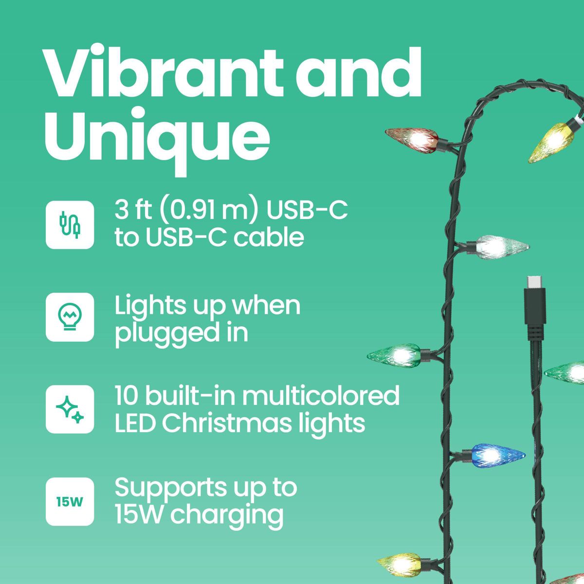 I recently tried out the GEMS 3-foot USB-C to USB-C Christmas lights cable and I’m impressed! The cable is nice and thick — feels sturdy and well-made instead of cheap and flimsy. It was super easy to plug into my phone/tablet charger, and once connected, the lights turned on instantly. The green cord blends nicely with holiday decorations and really adds to the festive vibe. I also like how compact 3 feet is — perfect for small spaces, desks, or around a computer area.