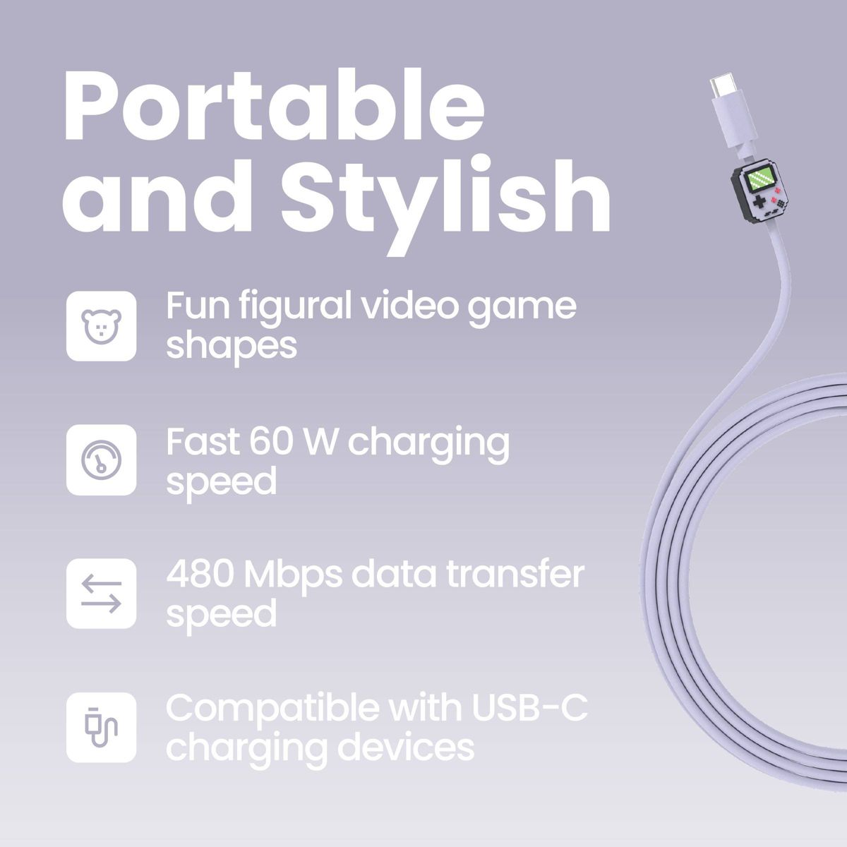 Liven up your charging setup with this GEMS Figural 3ft USB-C Cable! This stylish and powerful cable supports charging up to 60W and 480mbps data transfer speeds for fast and efficient performance. Featuring durable strain reliefs and playful charms, this cable combines fun and functionality. This unique USB-C cable is built to last, and designed to add a little charm to your charging.