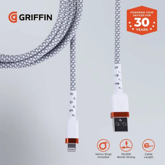 GRIFFIN Lightning to USB-A Cable, Ultra-Durable Fast Charging Lightning Cable with 48 Spindle Braiding, Aluminum Heads and 30,000 Bend Strength