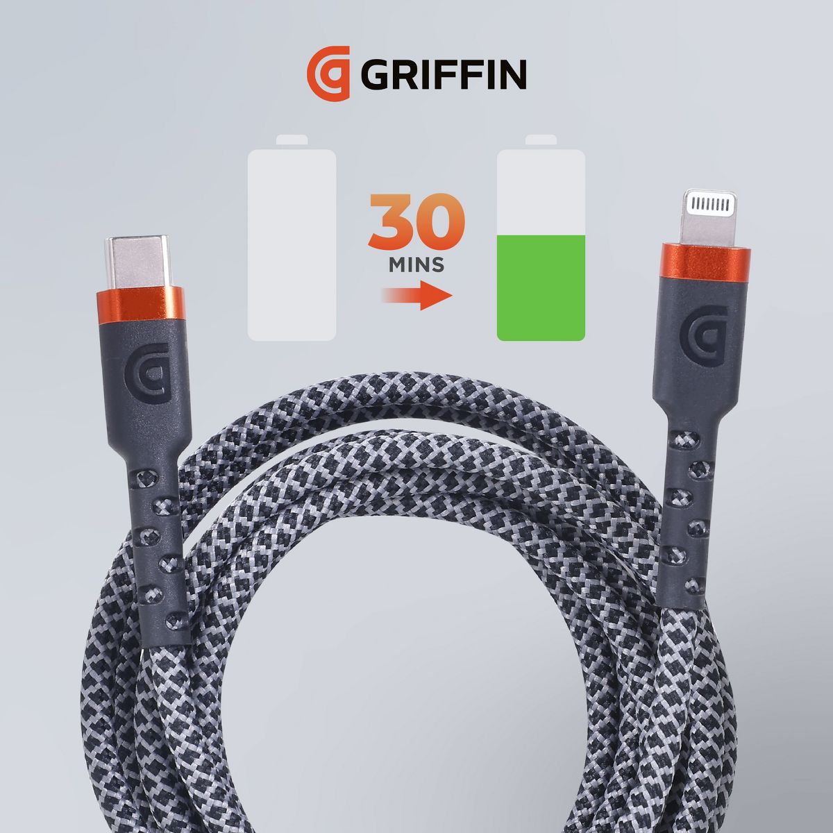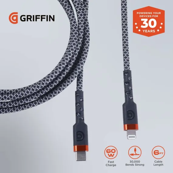 GRIFFIN Lightning to USB-C Cable, Braided Fast Charging with Reinforced Aluminum Connectors, Designed for Long-Term Performance and Reliability