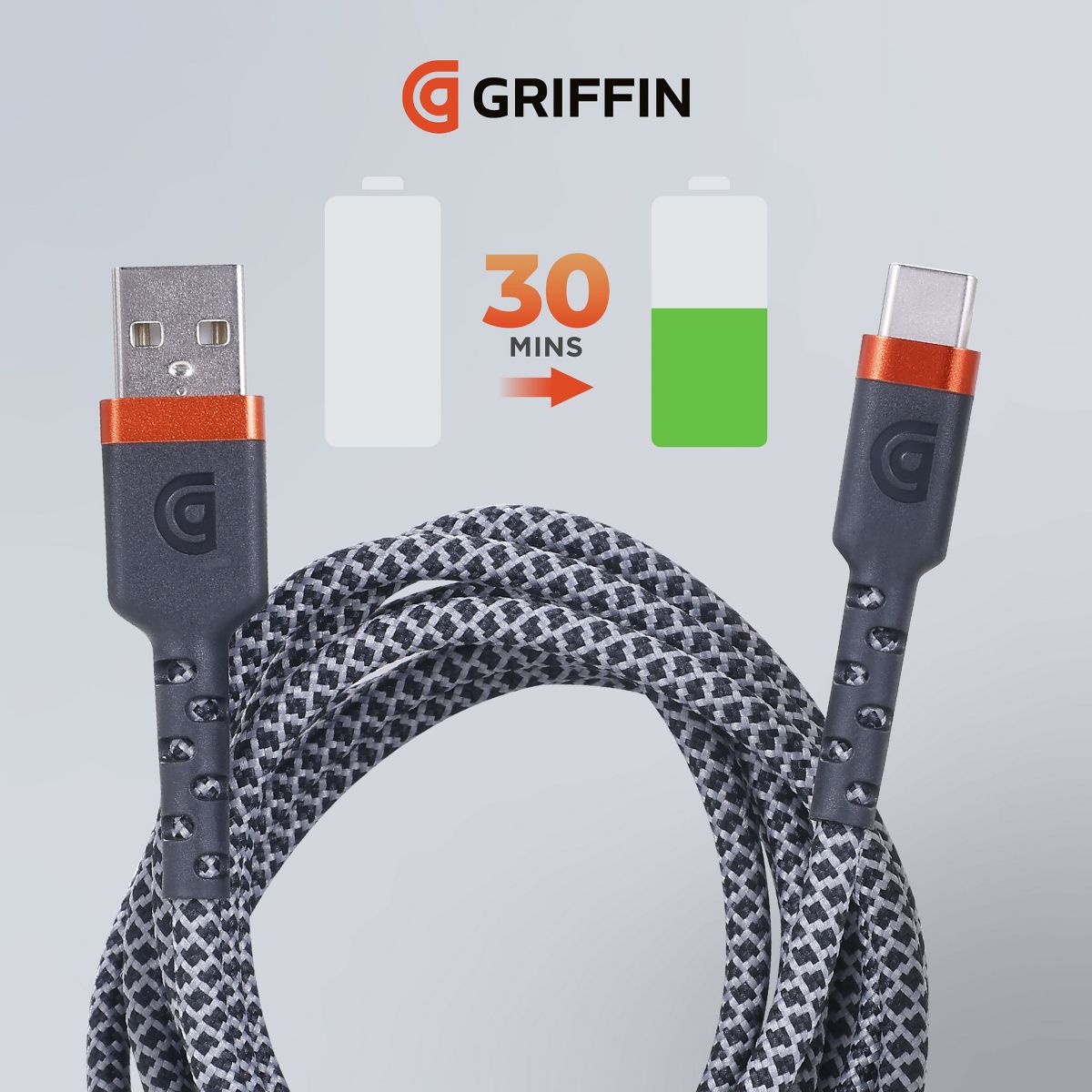 GRIFFIN USB-C to USB-A Fast Charging Cable, Heavy-Duty, Long-Lasting Braided Cord - 30,000 Bend Rating for Phones, Tablets, and More