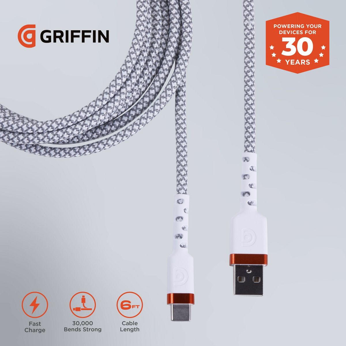 GRIFFIN USB-C to USB-A Fast Charging Cable, Heavy-Duty, Long-Lasting Braided Cord - 30,000 Bend Rating for Phones, Tablets, and More