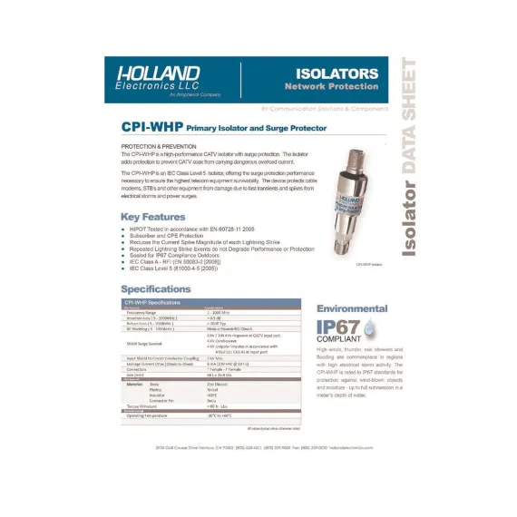The CPI-WHP is an IEC Class Level 5 isolator offering the surge protection performance necessary to ensure the highest telecom equipment survivability. The device protects cable modems, STB's and other CPE and plant equipment from damage due to fast transients and spikes from electrical storms and power surges. High winds, thunder, rain showers and flooding are commonplace in regions with high electrical storm activity. The CPI-WHP is rated to IP67 standards for protection against wind-blown objects and moisture - up to full submersion in a meter’s depth of water.