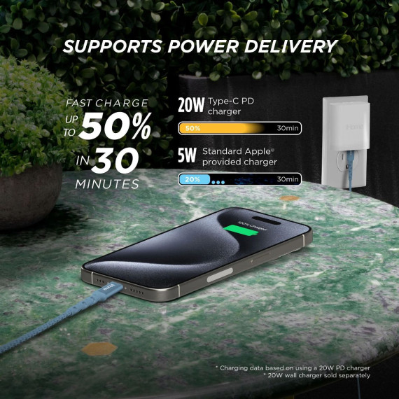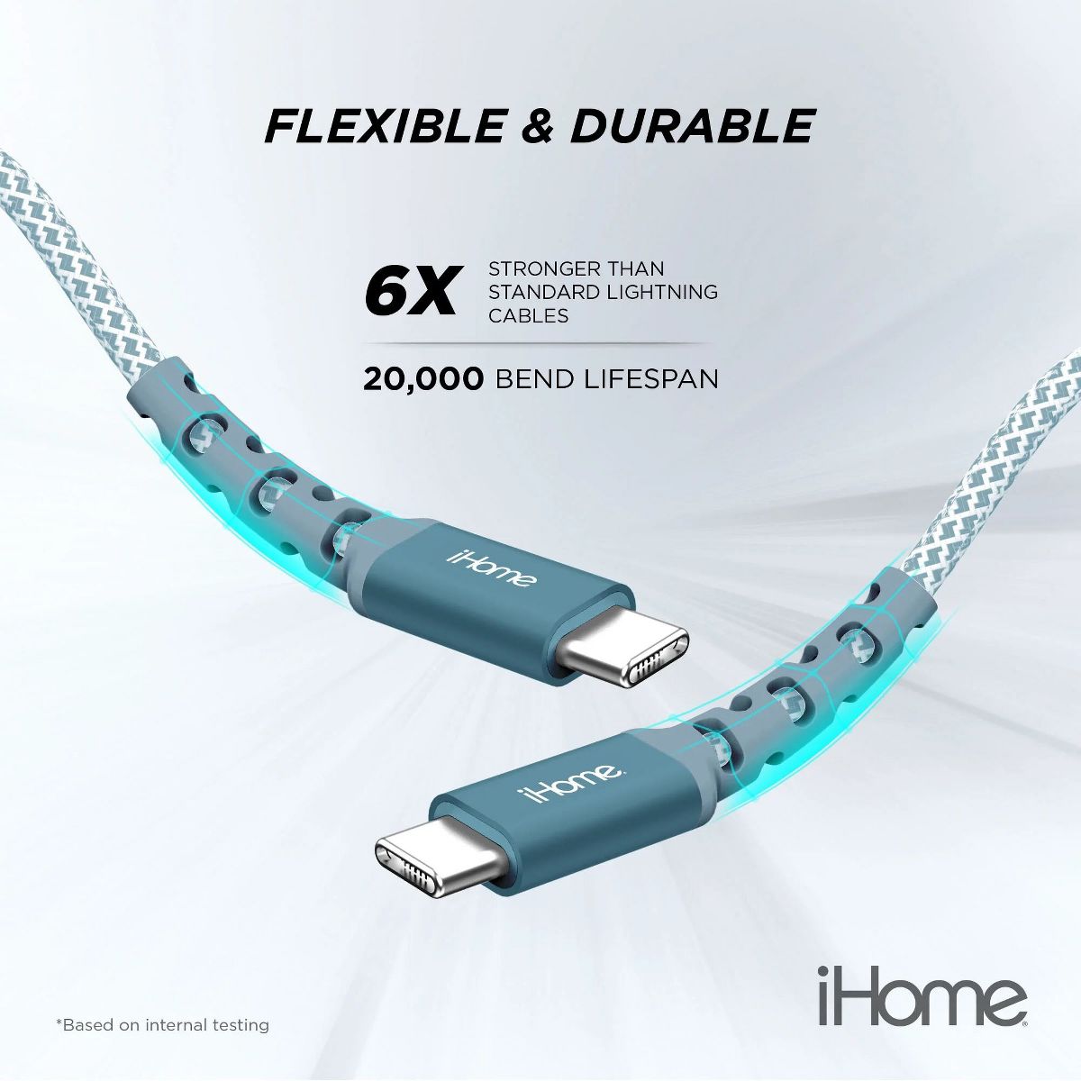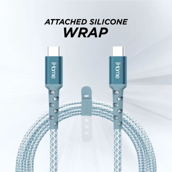iHome 6' USB-C to USB-C Cable, Nylon Braided with Cable Wrap, Blue