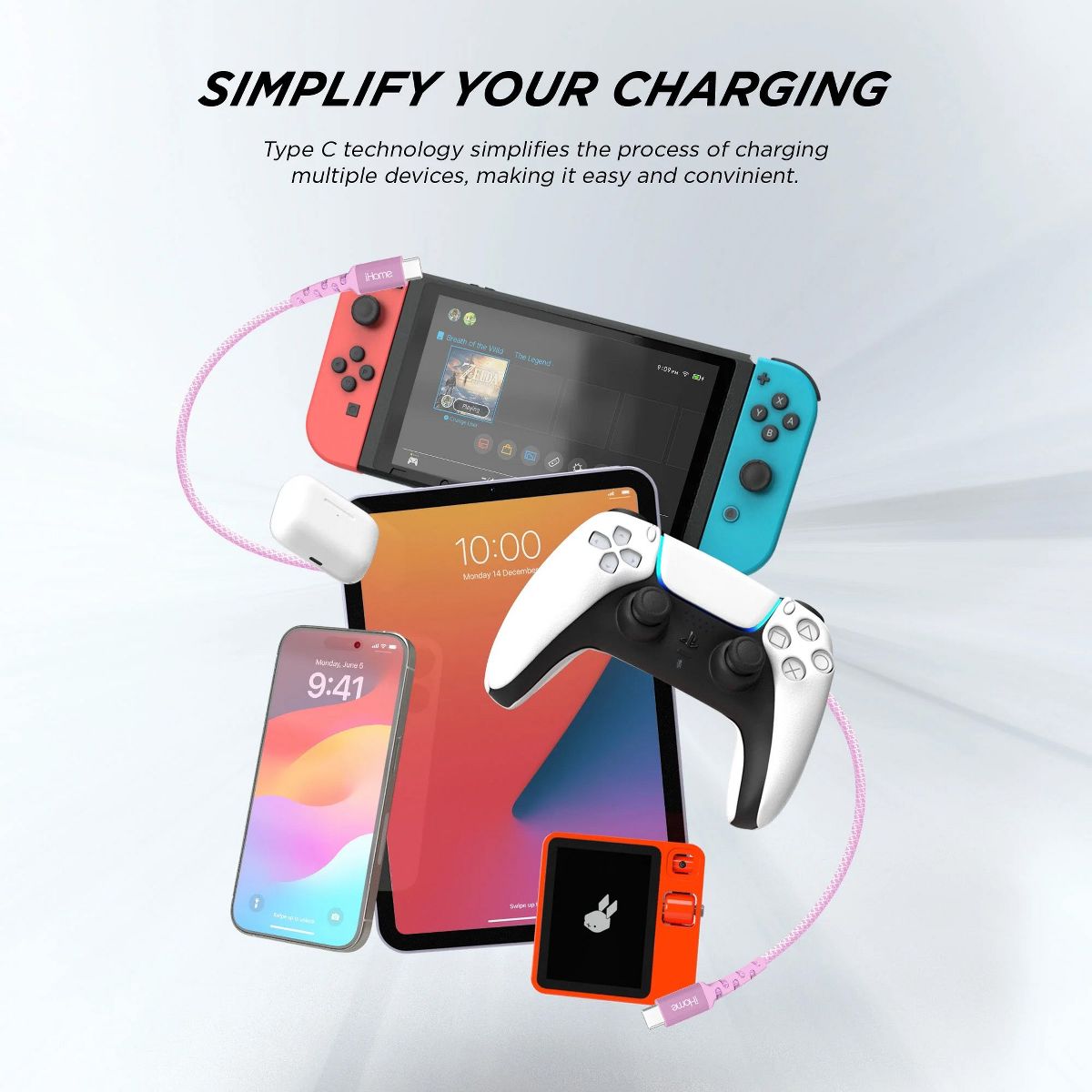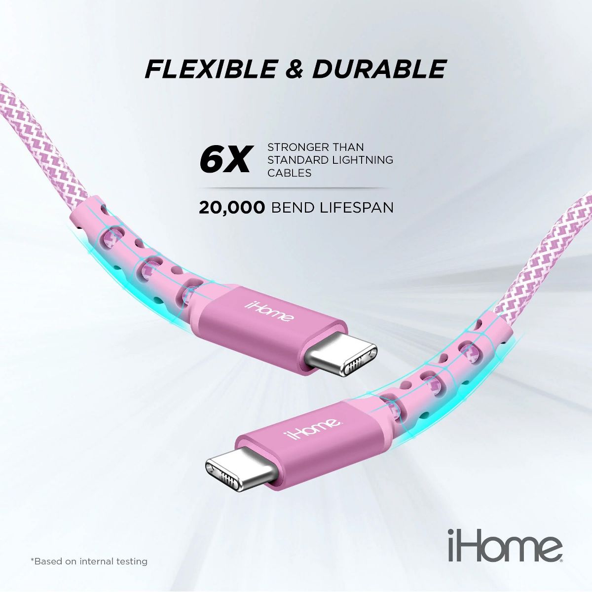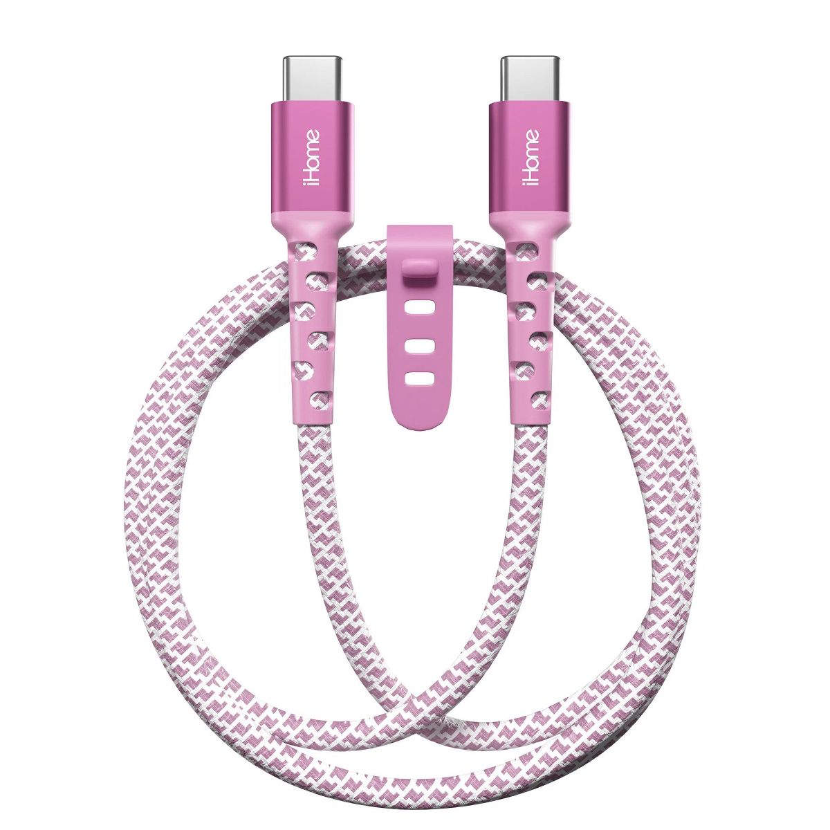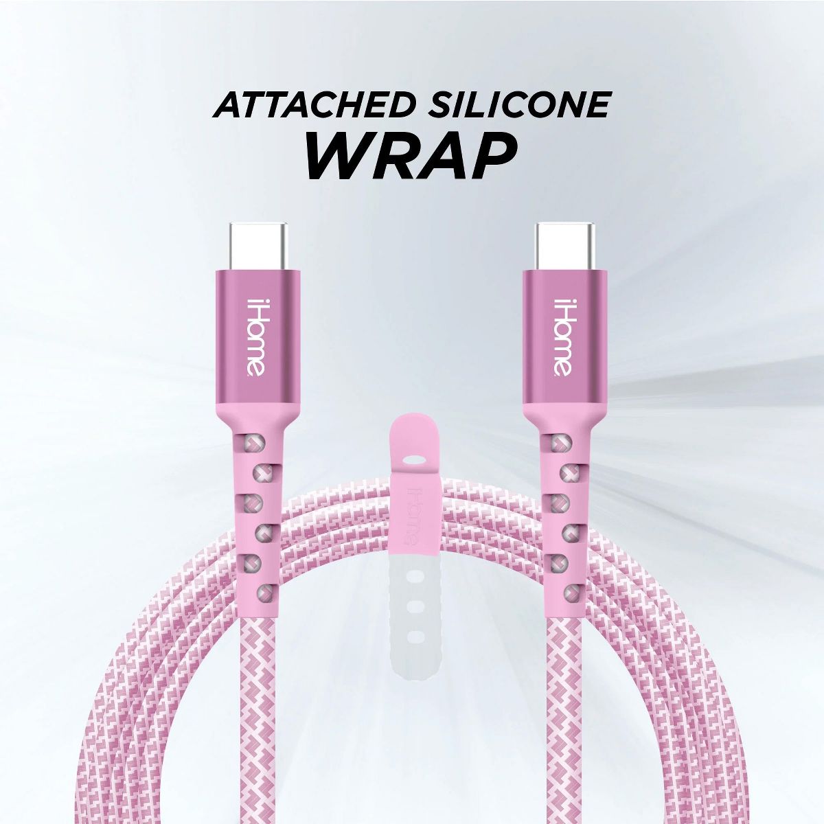 iHome 6' USB-C to USB-C Cable, Nylon Braided with Cable Wrap, Pink