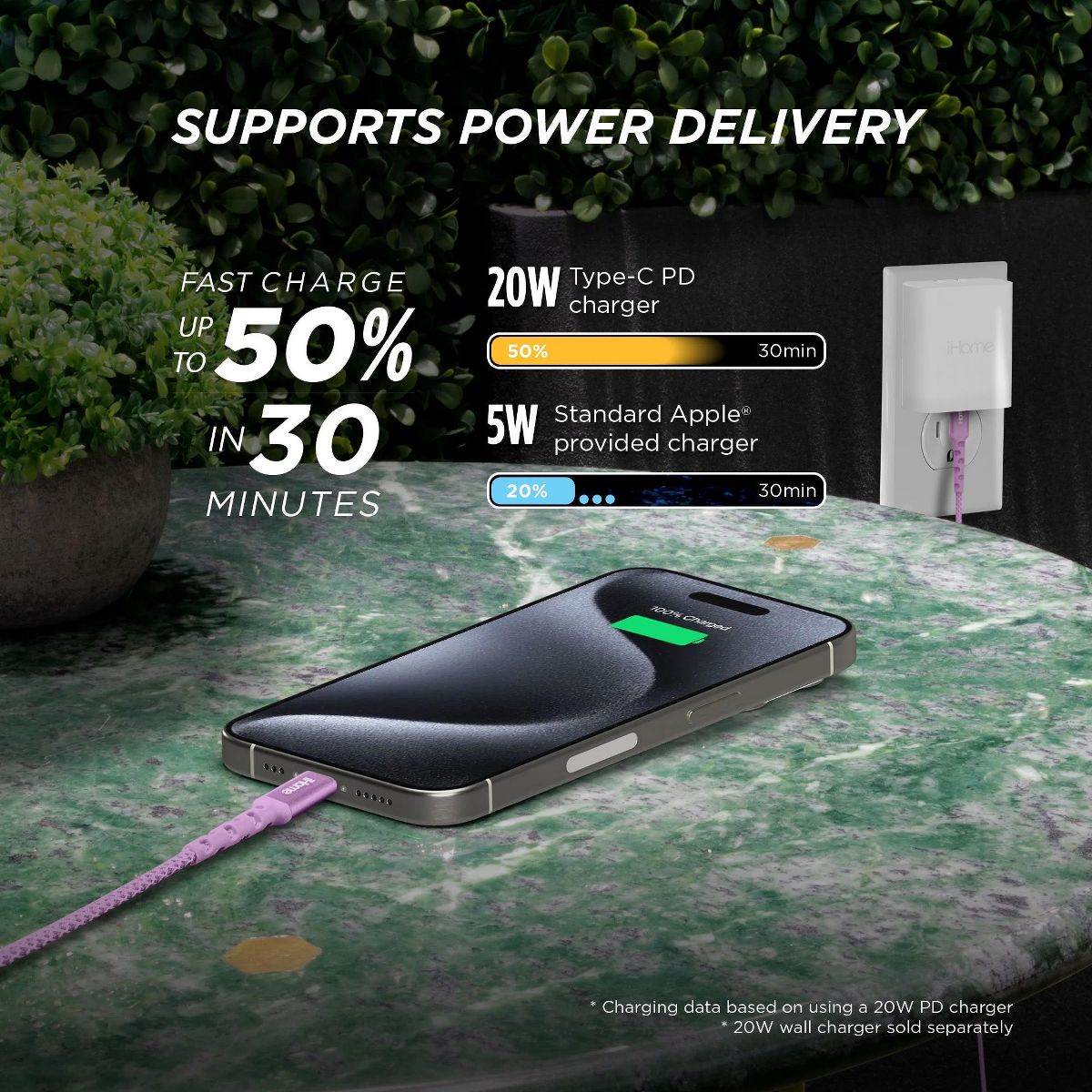 Upgrade to the iHome Fabric Braided Cable. Forget about cracking and breaking; this charging cable has a patented strain relief design and is made of high-quality fabric braided material to help prevent wear and tear. It has a reinforced cable neck designed to last over three times longer than a standard cable. This six-foot long cable is longer than the standard three-foot charging cable, giving you the flexibility for easy and convenient charging at home, the office, or the backseat of your car. It's available in a variety of colors, so you can find the one that best coordinates with your phone case and style. Keep your electronics connected with the iHome Fabric Braided Cable.