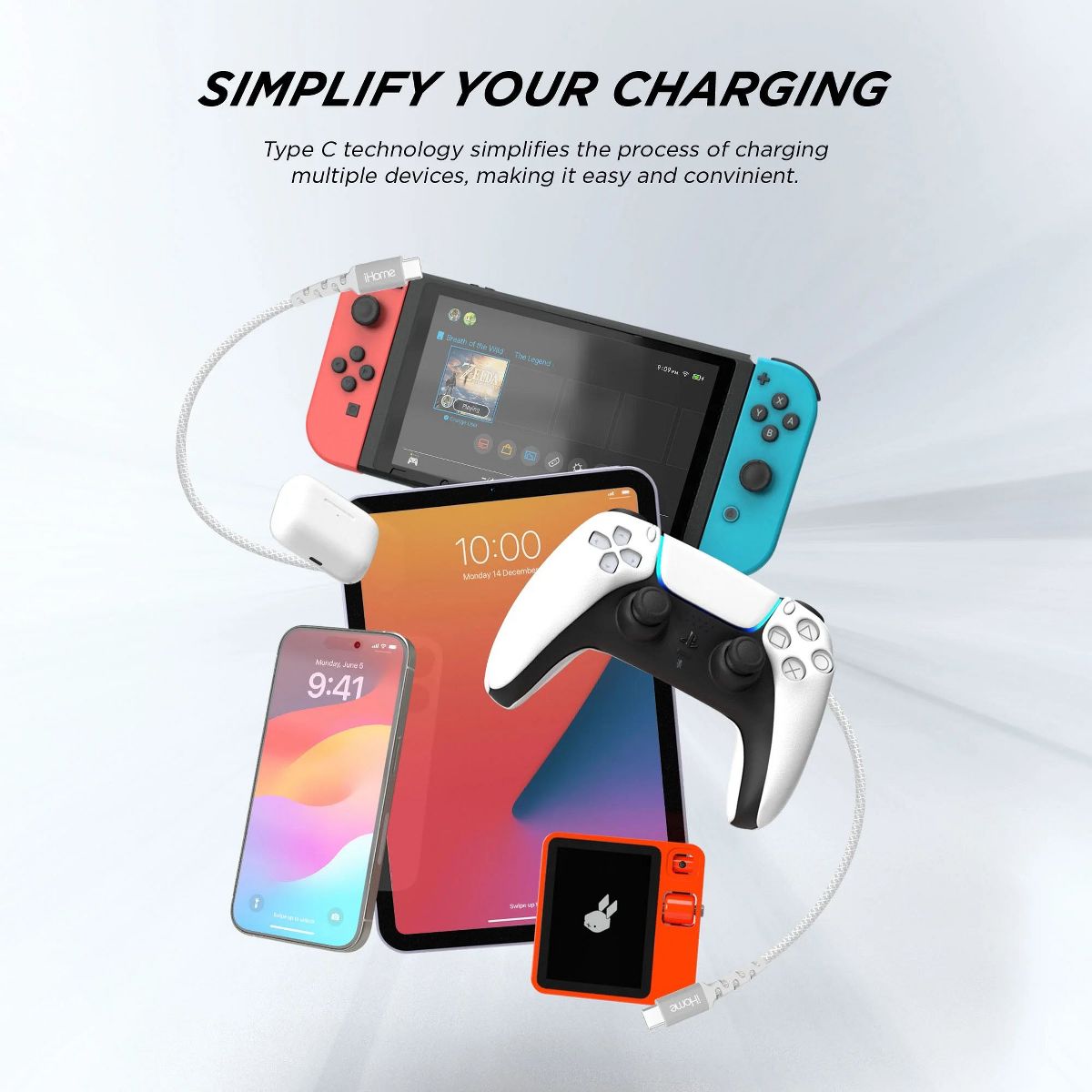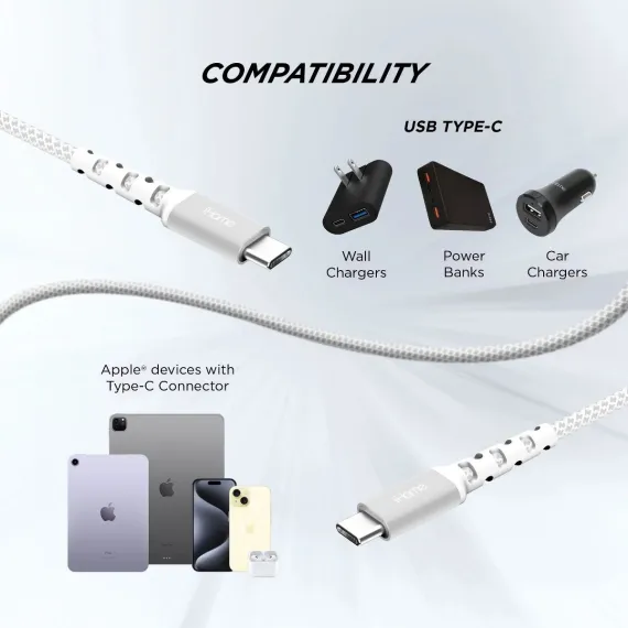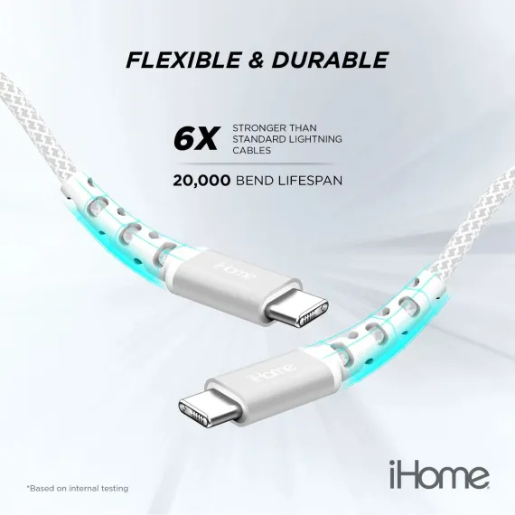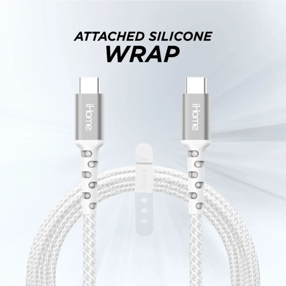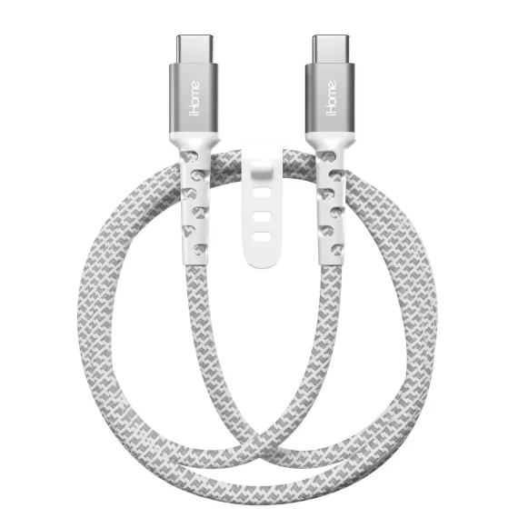 iHome 6' USB-C to USB-C Cable, Nylon Braided with Cable Wrap, White