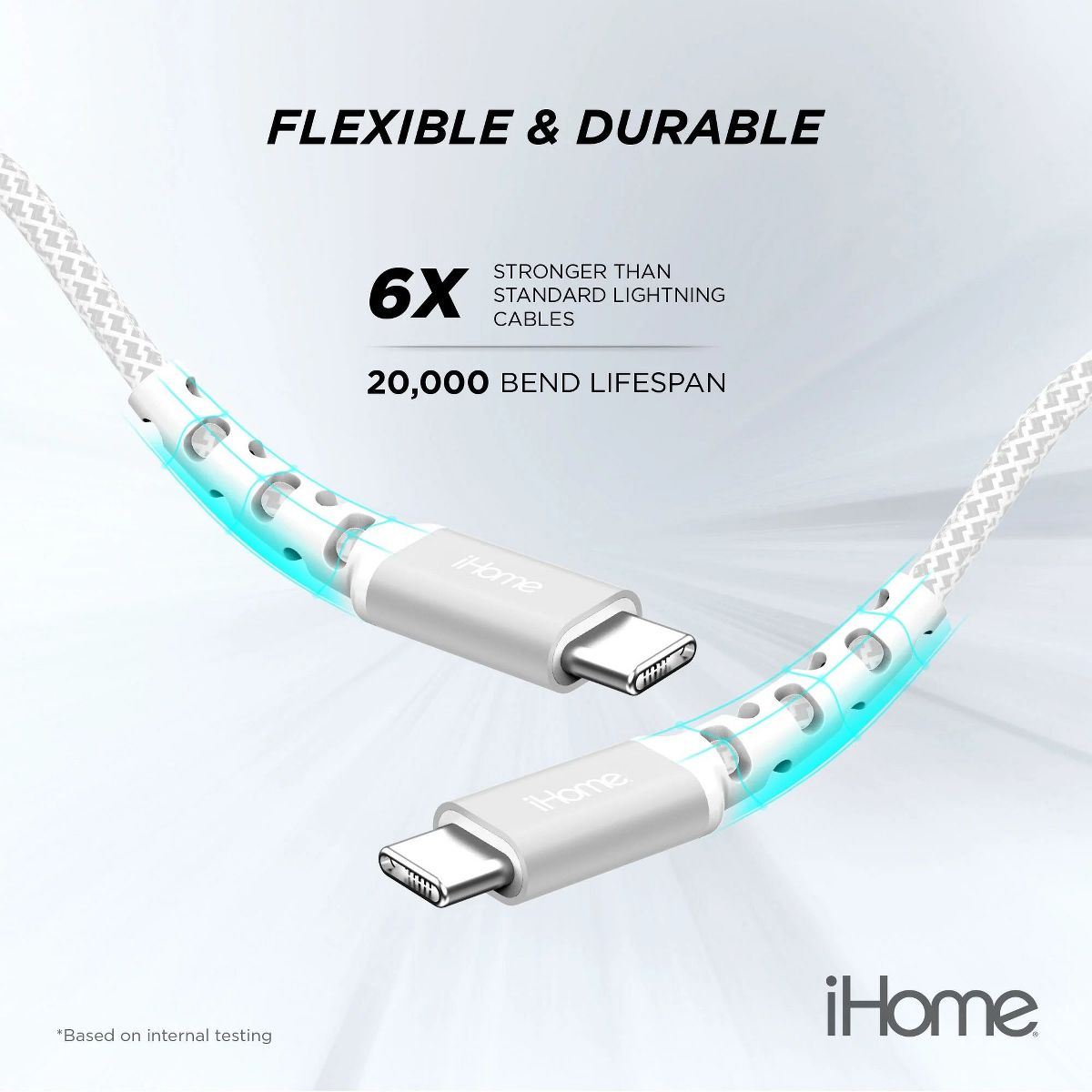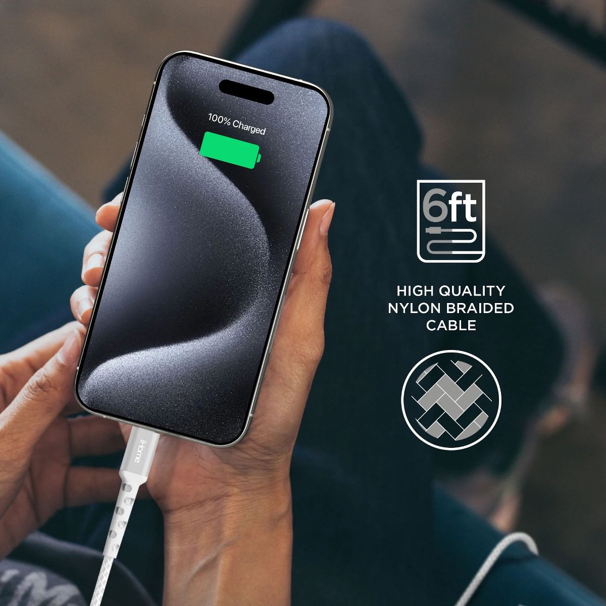 Upgrade to the iHome Fabric Braided Cable. Forget about cracking and breaking; this charging cable has a patented strain relief design and is made of high-quality fabric braided material to help prevent wear and tear. It has a reinforced cable neck designed to last over three times longer than a standard cable. This six-foot long cable is longer than the standard three-foot charging cable, giving you the flexibility for easy and convenient charging at home, the office, or the backseat of your car. It's available in a variety of colors, so you can find the one that best coordinates with your phone case and style. Keep your electronics connected with the iHome Fabric Braided Cable.