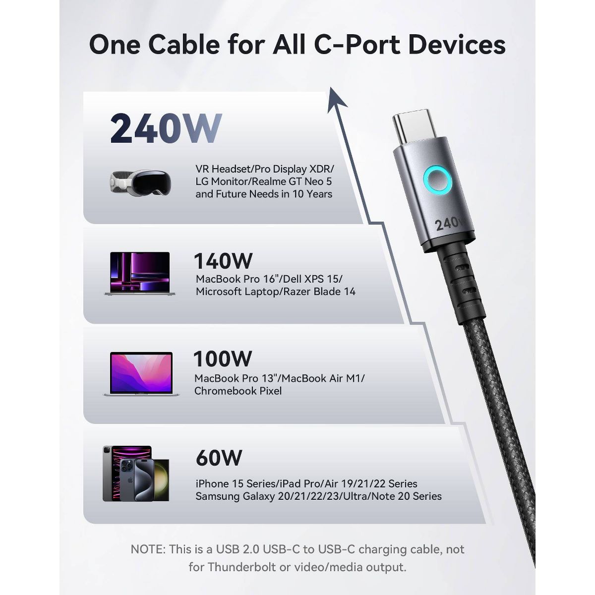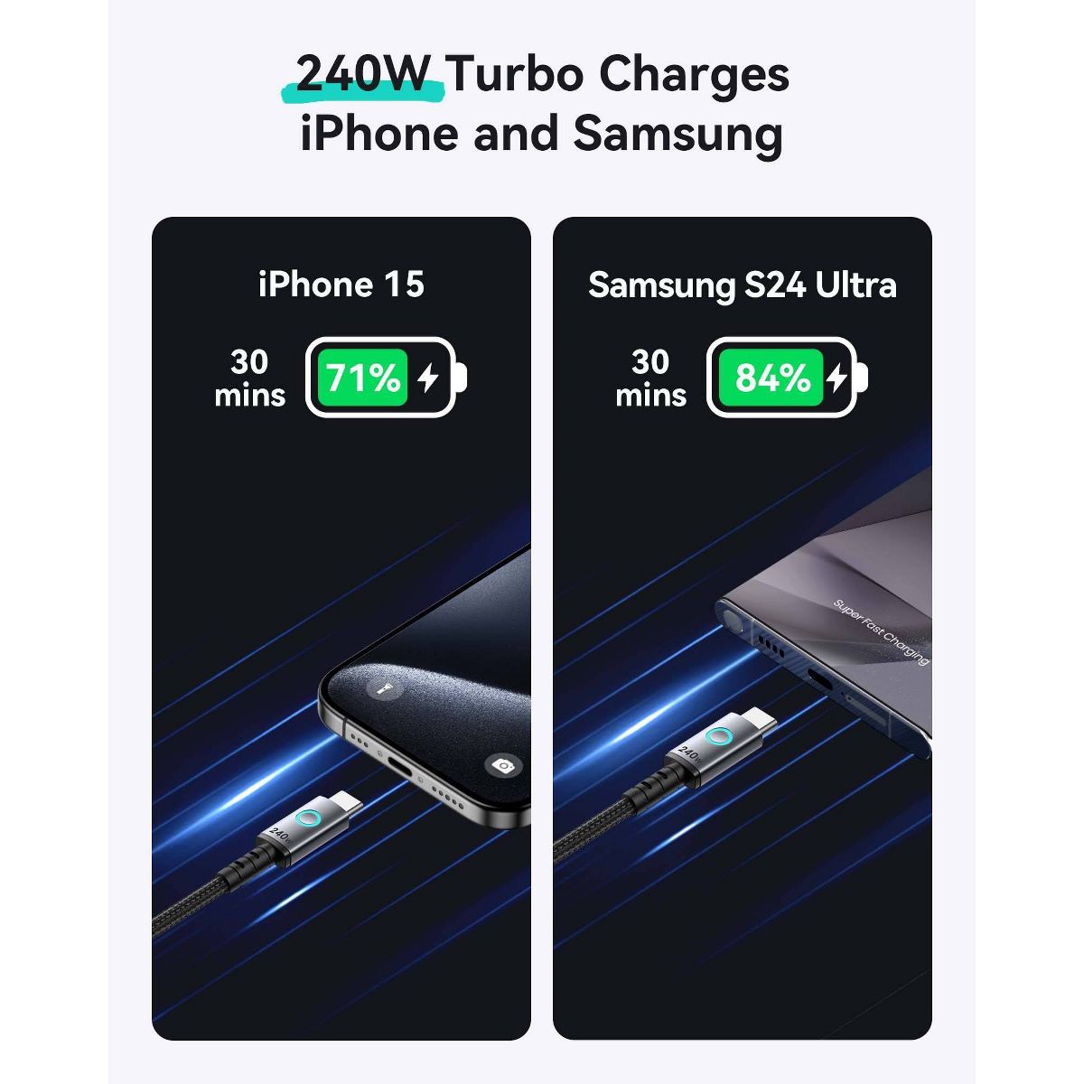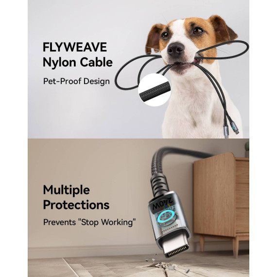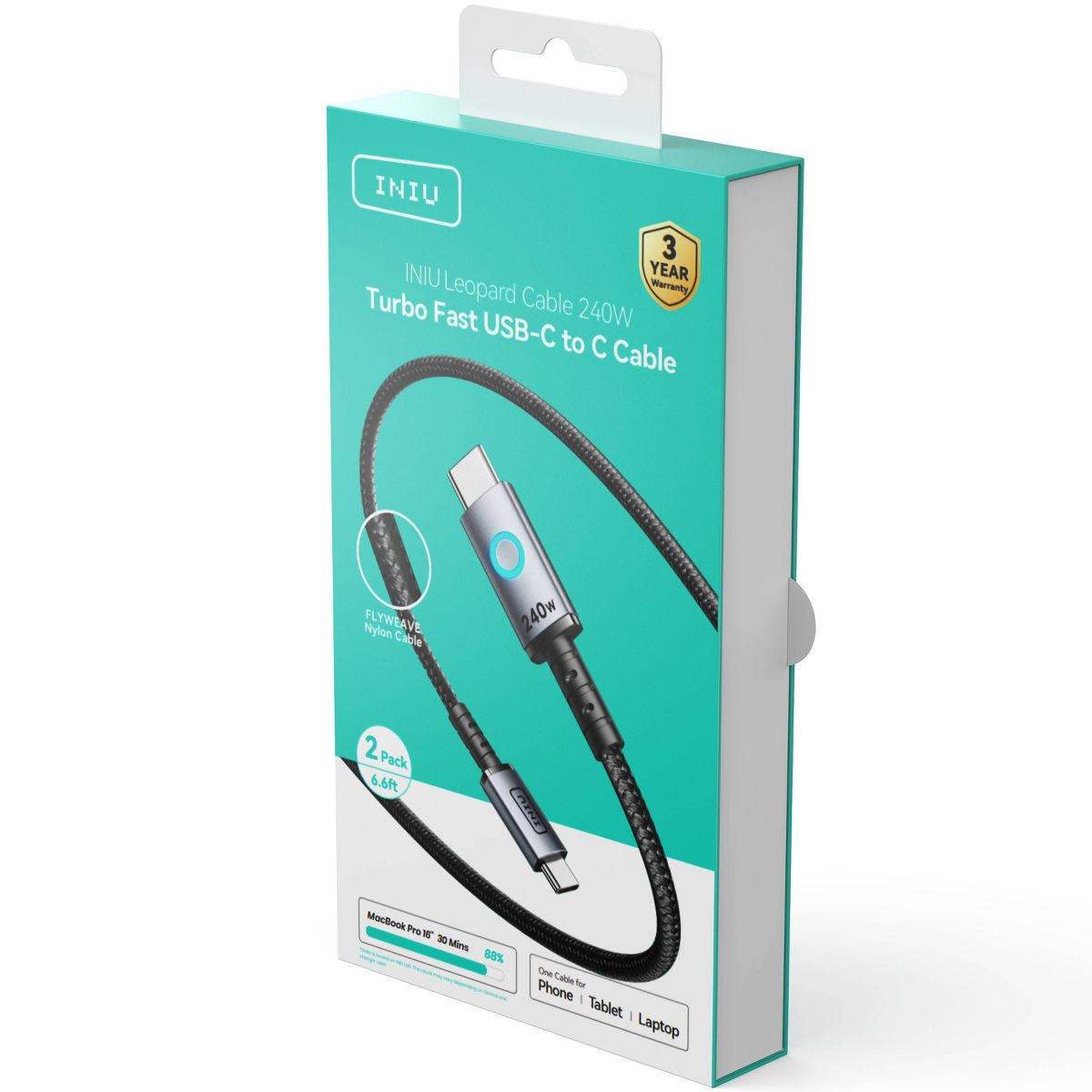 INIU Leopard Cable 240W—your ultimate charging solution! Charge your iPhone 16/15 to 71% in just 30 minutes with this lightning-speed USB-C to USB-C cable. Experience the fastest charging ever: power your MacBook Pro to 88%, iPad Pro to 91%, Samsung S23 to 84%, and SteamDeck to 65%, all in 30 minutes! Compatible with all C-port devices, it ensures efficient charging for laptops, phones, and more. Plus, INIU's EMARK2.0 technology safeguards against overcharging and overheating. Stay powered safely! What's more, you are also back up with industry-leading 3-year warranty!