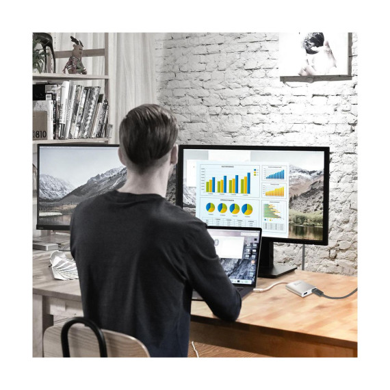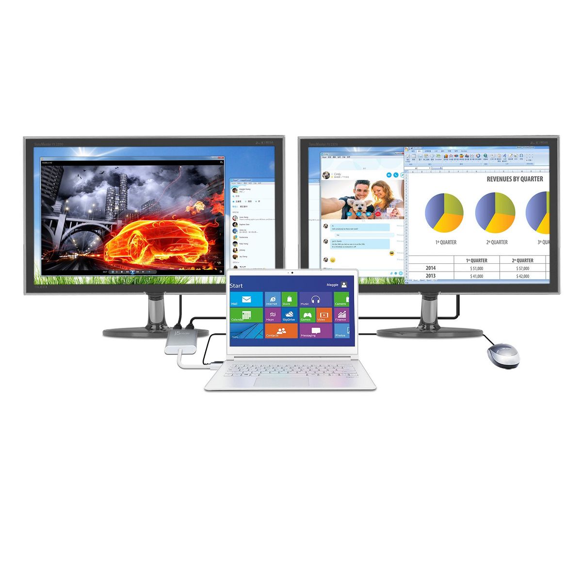 This USB 3.0 to Dual HDMI Multi-Monitor Adapter acts as an external video card for your MacBook or Windows computers. It allows you to add two additional displays through your USB 3.0 port, boosting your productivity by giving you more screen space to work from. One of the HDMI ports can output resolutions up to 4K, while the other can output resolutions up to 2048 x 1152.