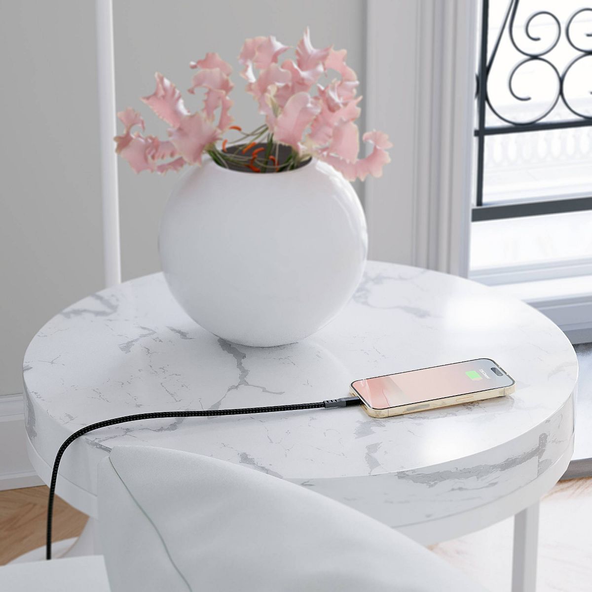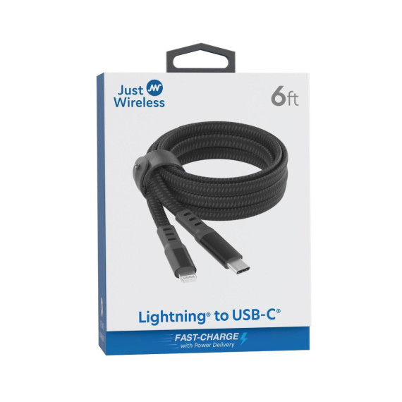 The Just Wireless Ultra 6' Lightning® to USB-C nylon braided charging cable is the ultimate companion for your tech-fueled life. This cable is engineered with a double injection process, nylon braiding, and ultra-strength connector joints, ensuring unmatched durability and performance. It provides a reliable charging solution for a wide range of Apple® Lightning devices including iPhone®, iPad® (Lightning models), AirPods®, battery pack, and other devices.