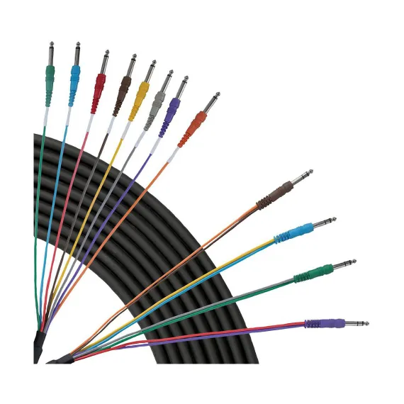 4 stereo 1/4" TRS send/return connectors to dual mono 1/4" TS connectors. Color-coded for easy ID. For use with patch bays, mixing consoles, rack cabling. Molded strain relief.