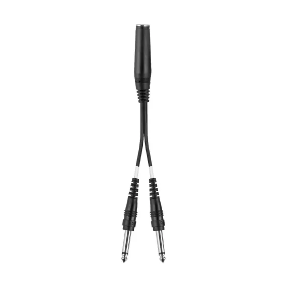Unbalanced mono Y-adapter 6". 1/4" TS female to dual 1/4" TS male. Ideal for splitting an unbalanced mono signal into dual mono left/right signals.
