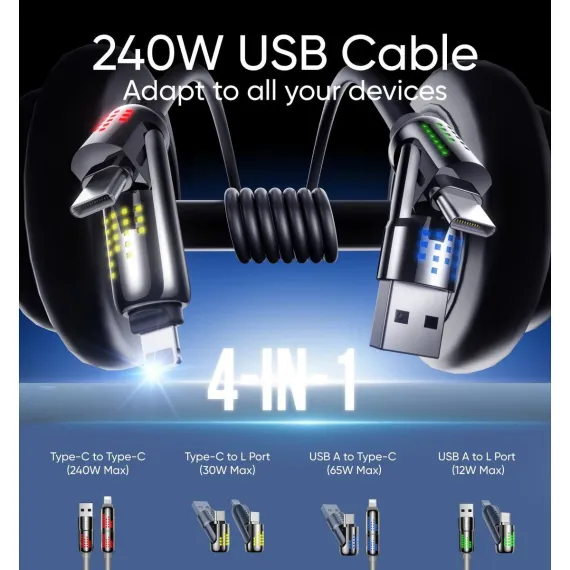 [PD3.1 E-Mark Chip for Safety & RGB Breathing Light] Equipped with an advanced PD3.1 E-Mark chip, this cable enables 240W fast charging while protecting your devices with 24/7 constant-temperature charging. It auto-stops when fully charged to prevent overcharging and battery damage. And when charging, soft RGB lights on both ends cycle through colors—no harsh glare, just a cool gaming vibe to elevate your setup.