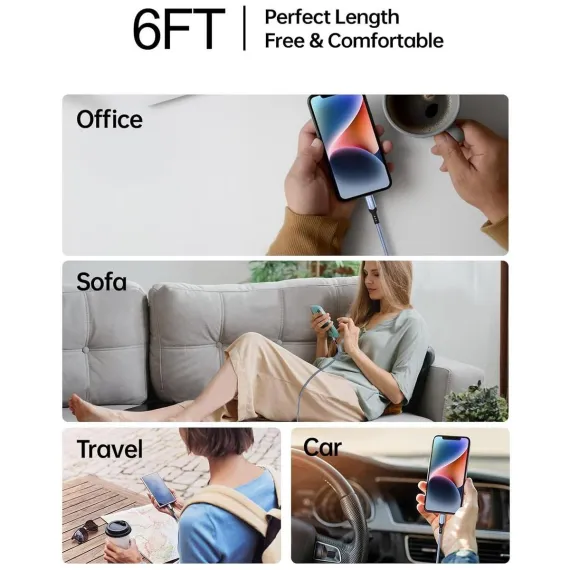 【ADVANCED DESIGN】iPhone Charger Fast Charging Cable features an ergonomic design that successfully prevents typical wear, strain, cable and connection issues and extends the life of your charging cable. Its ergonomic design makes it easier and more comfortable to play games, use apps in portrait mode, watch videos and read e-books while charging. 【QUICK CHARGE & DATA SYNC】 iPhone Charger Cable is made of high-purity copper core and smart chip, with overcharge protection, steady current protection, It supports up to 2.4A charging speed and provides a data transfer rate of 480 Mbps, allowing you to sync your files and media in no time. 【AMAZING DURABILITY】 iPhone Charger Cord has electronic safety certification to the appropriate standards and has built-in laser welding technology to ensure that the metal parts will not break. The longeranti-break design enhances the durability of the cable. After 40,000+ bend tests, the flexible and durable double-braided nylon Lightning Cable lasts longer and never breaks. 【PERFECT COMPATIBILITY】 iPhone Charging Cable compatible with iPhone 14/13/12/11 Pro Max/ XS Max/ XS/ XR/ X/ 8 Plus/8/ 7 Plus/ 7/6S Plus/ 6S/6 Plus/6/ 5S/ 5C/ 5/ Mini/ SE/iPad/ iPad/ Airpods. 【WHAT YOU GET】 2 × USB-A to Lightning Cable(6ft)