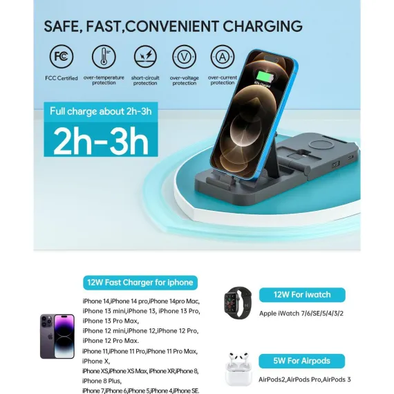 【Widely Compatibility】This wireless charging dock has wide compatibility to cover Android and IOS devices, including iPhone 14/14Pro/14 Pro max/13/13Pro/13Pro Max/13 mini/12/12Pro/12Pro Max/12 mini/11/11Pro/11Pro Max/ XS/XR/XS MAX/X/8/ 8Plus, Apple iWatch 7/6/SE/5/4/3/2, AirPods Pro/3/2/1, Samsung Galaxy Series and more other phone models with wireless charging function.