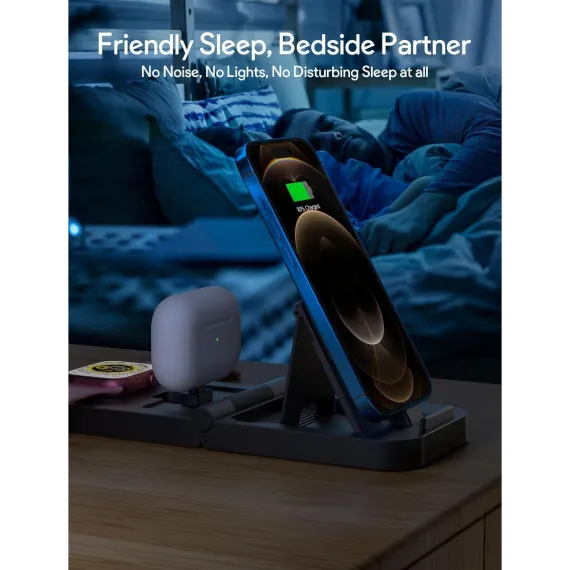 【Case Friendly & Sleep Friendly】Our wireless charging stand allows you to use it without removing the phone case, making it more user-friendly. When charging, the LED indicator on the front of the product emits a soft, non-glare blue light that won't interfere with your night's sleep. Note: Please remove metal accessories and credit cards before charging.