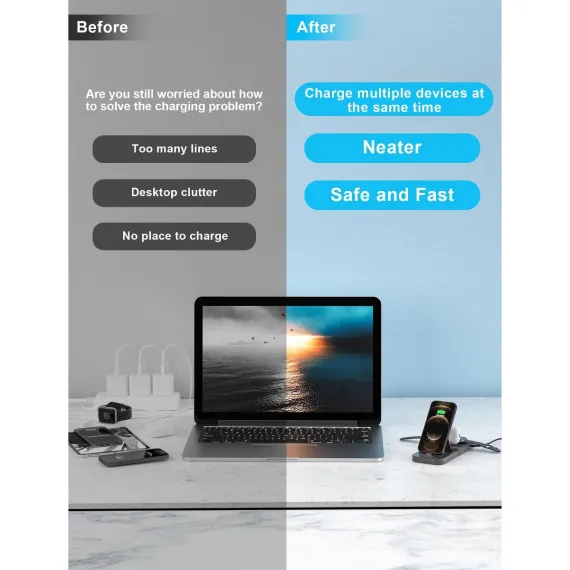 【Safety Fast Charging】Our wireless charging station adopts intelligent protection technology, which provides temperature control, overvoltage protection, short circuit protection, and overcurrent protection to ensure safe and fast charging. In addition, we added cooling holes on the back to reduce heat during charging. The USB-A port on the bottom of the item allows you to charge other devices.