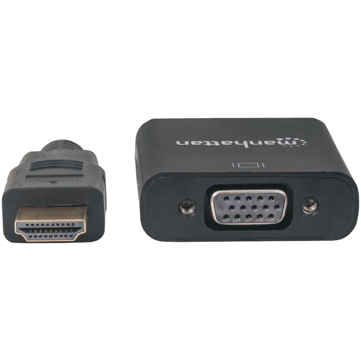 Easily connect an HDMI source with a VGA display with the Manhattan 151467 HDMI Male to VGA Female Converter. It helps establish a fast, simple and convenient link between newer HDMI-equipped desktop and laptop computers and other media sources with existing VGA monitors, projectors and other display devices. This HDMI to VGA converter is easy and quick to install and requires no complicated configuration or setup to help extend the service life and fully realize the investment and value of legacy VGA displays, projectors and other equipment. This low-power, cost-effective and reliable solution allows users to transition to HDMI bandwidths, resolutions, Deep Color and more without the expense of upgrading to newer and costly monitors and projectors. Its integrated, all-in-one design helps achieve a compact, integrated solution that eliminates unnecessary cables, tangles and clutter to keep installations and work spaces neat and orderly.