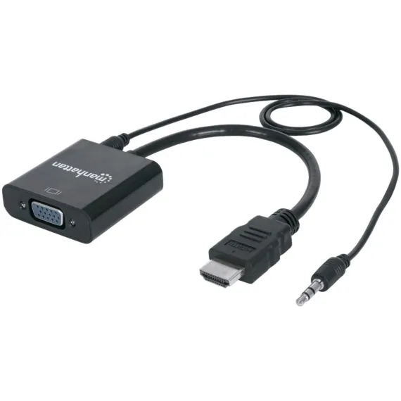 Here's a simple solution to connecting media and display devices! The Manhattan 151559 HDMI to VGA Converter helps establish a fast, simple and convenient link between newer HDMI equipped desktop and laptop computers and other media sources with existing VGA monitors, projectors and other display devices. The Manhattan HDMI to VGA Converter is easy and quick to install and requires no complicated configuration or setup to help extend the service life and fully realize the investment and value of legacy VGA displays, projectors and other equipment. This low-power, cost-effective and reliable solution allows users to transition to HDMI bandwidths, resolutions, Deep Color and more without the expense of upgrading to newer and costly monitors and projectors. Its all-in-one design helps achieve a compact, integrated solution that eliminates unnecessary cables, tangles and clutter to keep installations and work spaces neat and orderly. Its 3.5 mm stereo port allows the converter to transmit audio to an external audio device with convenient, included 3.5 mm audio cable, and its micro USB port allows for additional power if required._