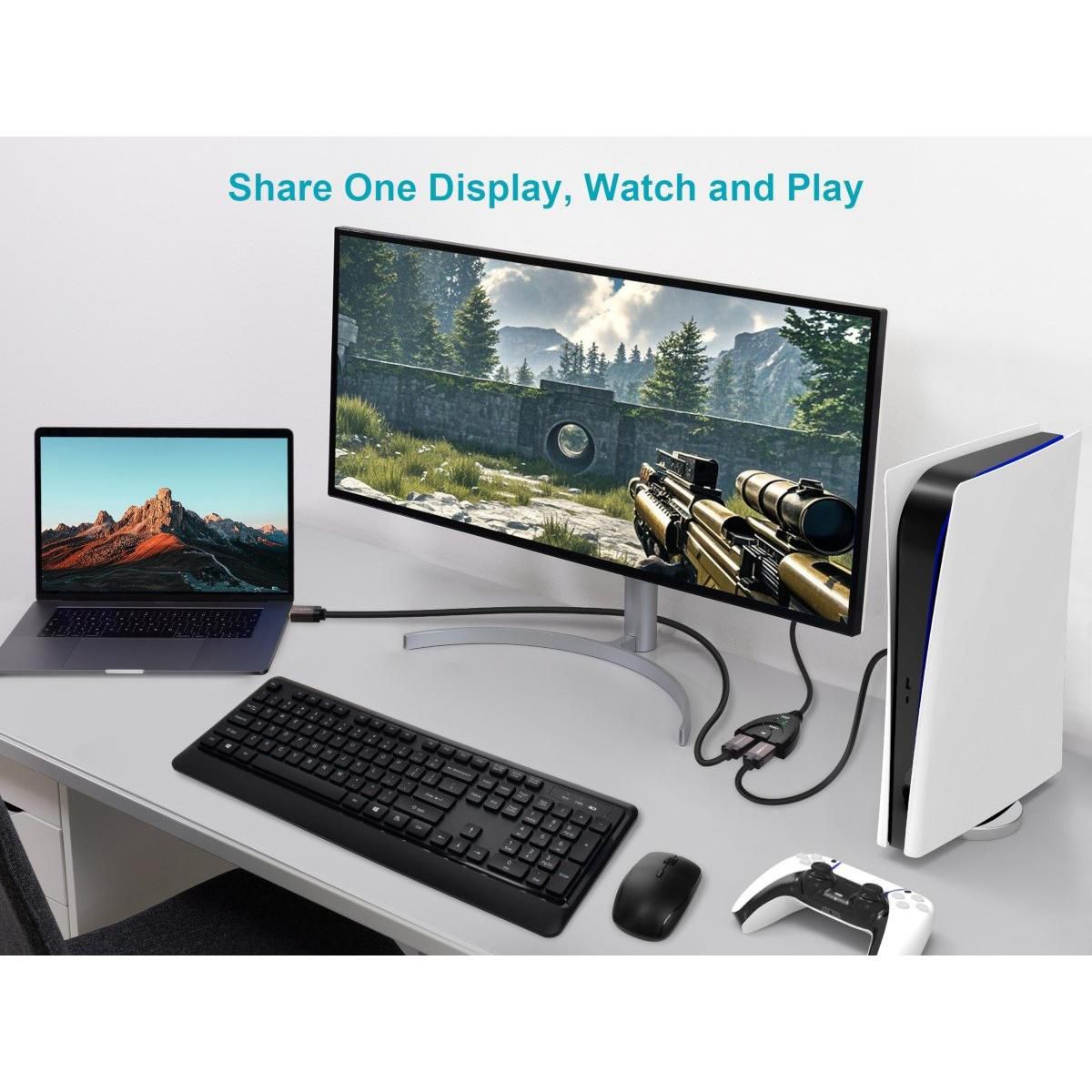 The switch will automatically switch between inputs, depending on which one is on at the time. If both source devices are on, just press the small button on the switch to change the input.