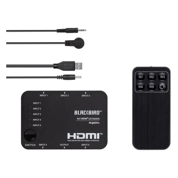Monoprice Blackbird 4K 5x1 HDMI 2.0 Switch, HDR, HDR10, 18G, HDCP 2.2, Dolby Vision, 4K@60Hz, Hybrid Log-Gamma, 5 Inputs 1 Output, With IR Controler
