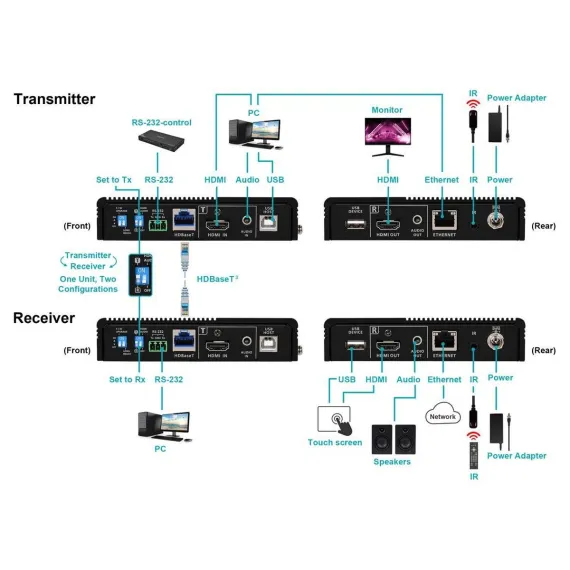 Monoprice Blackbird True 4K HDMI USB HDBaseT 3.0 Transceiver [TAA] Over Single Cat6a, Up To 100m (328ft) HDCP 2.2, HDR, Bi-directional IR, RS-232, USB