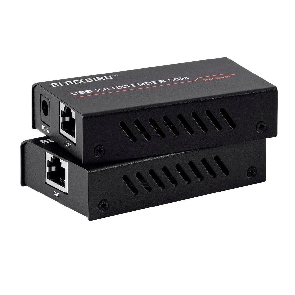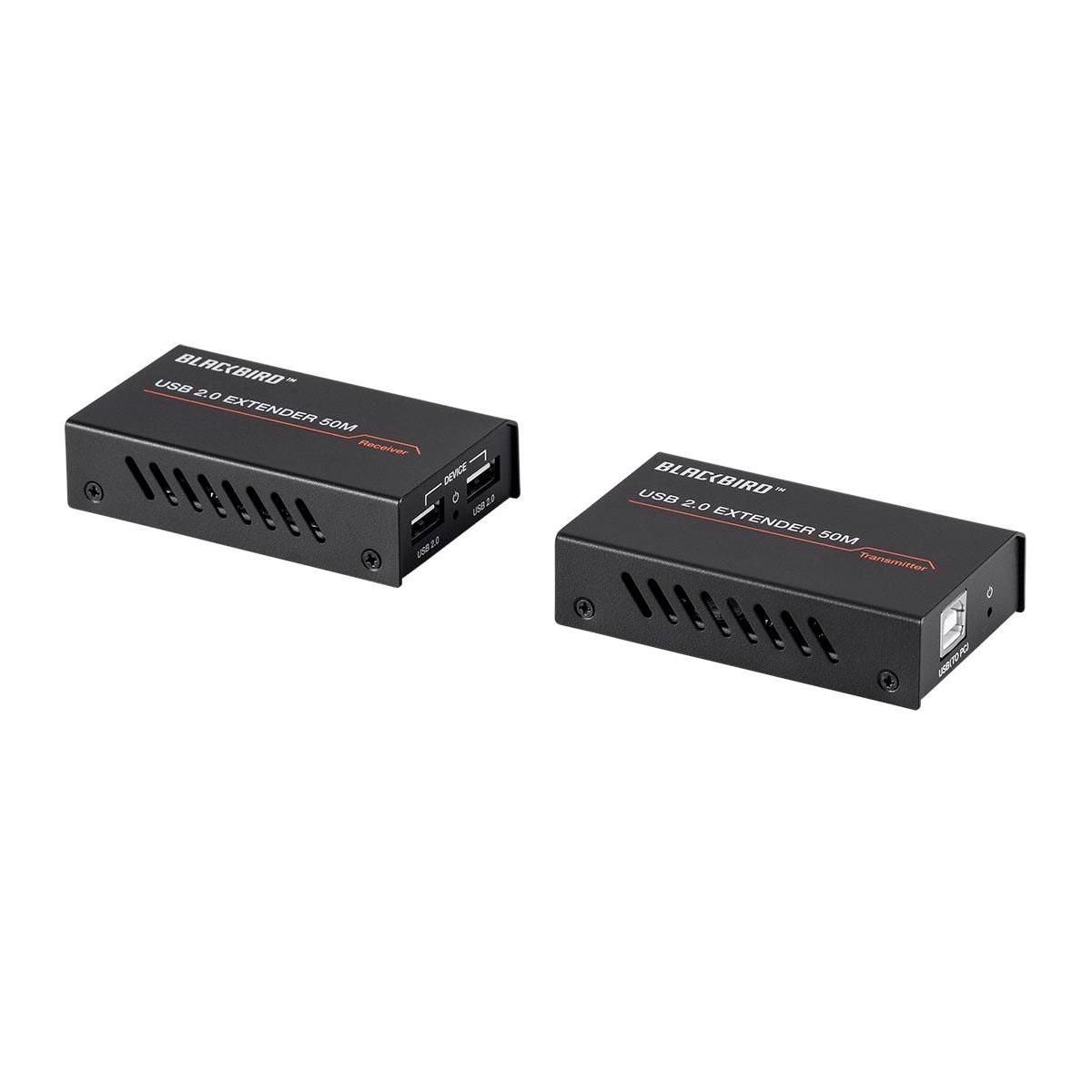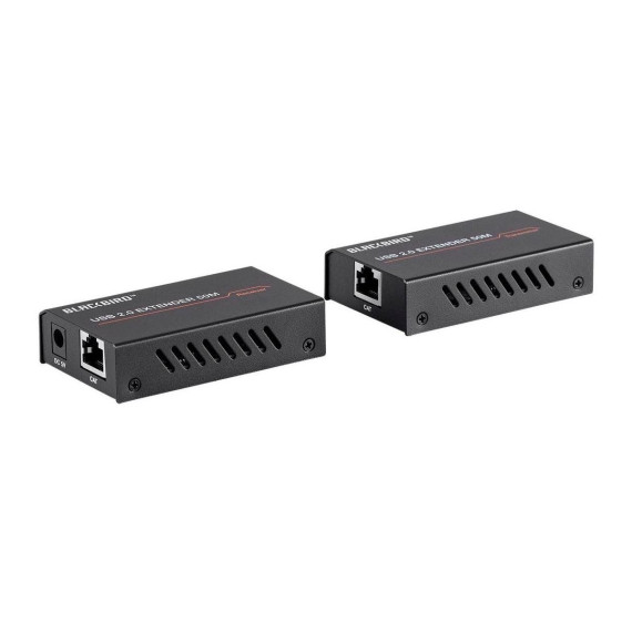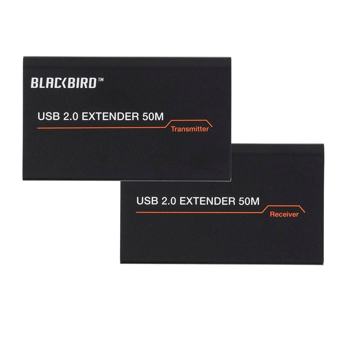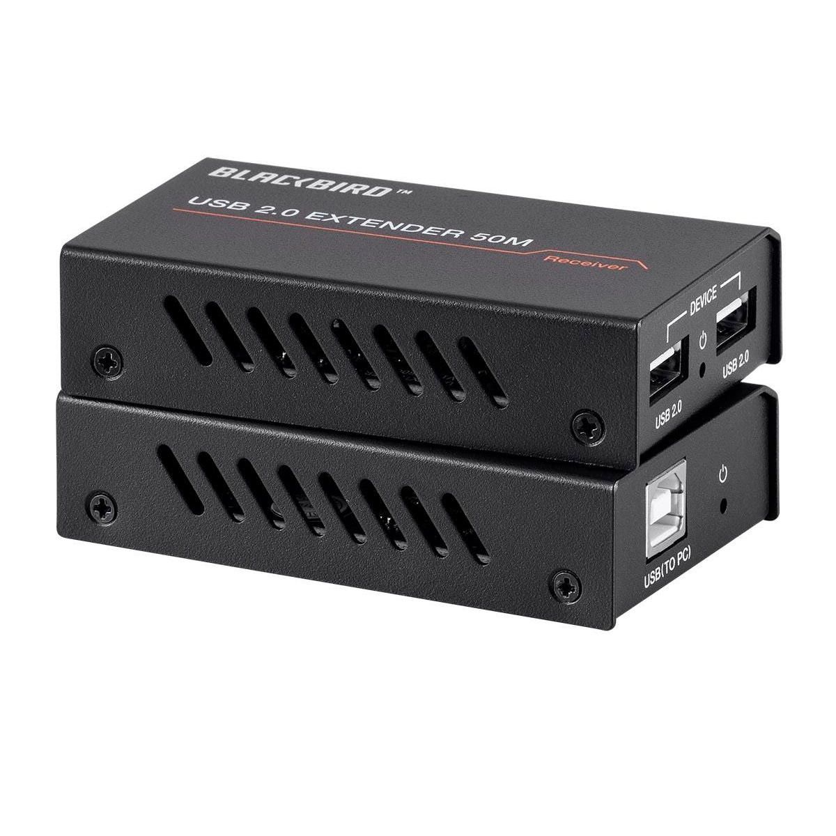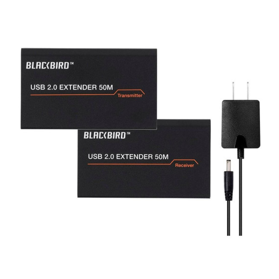 This Blackbird USB 2.0 2-Port Extender can extend USB signals to distances up to 164 feet (50 meters) over a single Cat5e/6 Ethernet cable. The transmitter receives its power from the USB connection, while a 5 VDC, 1A AC power adapter is included for use with the receiver. It supports data rates up to 480Mbps and is a true plug and play device, with no drivers or special configuration required.