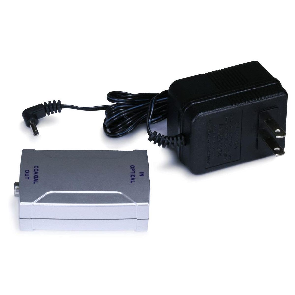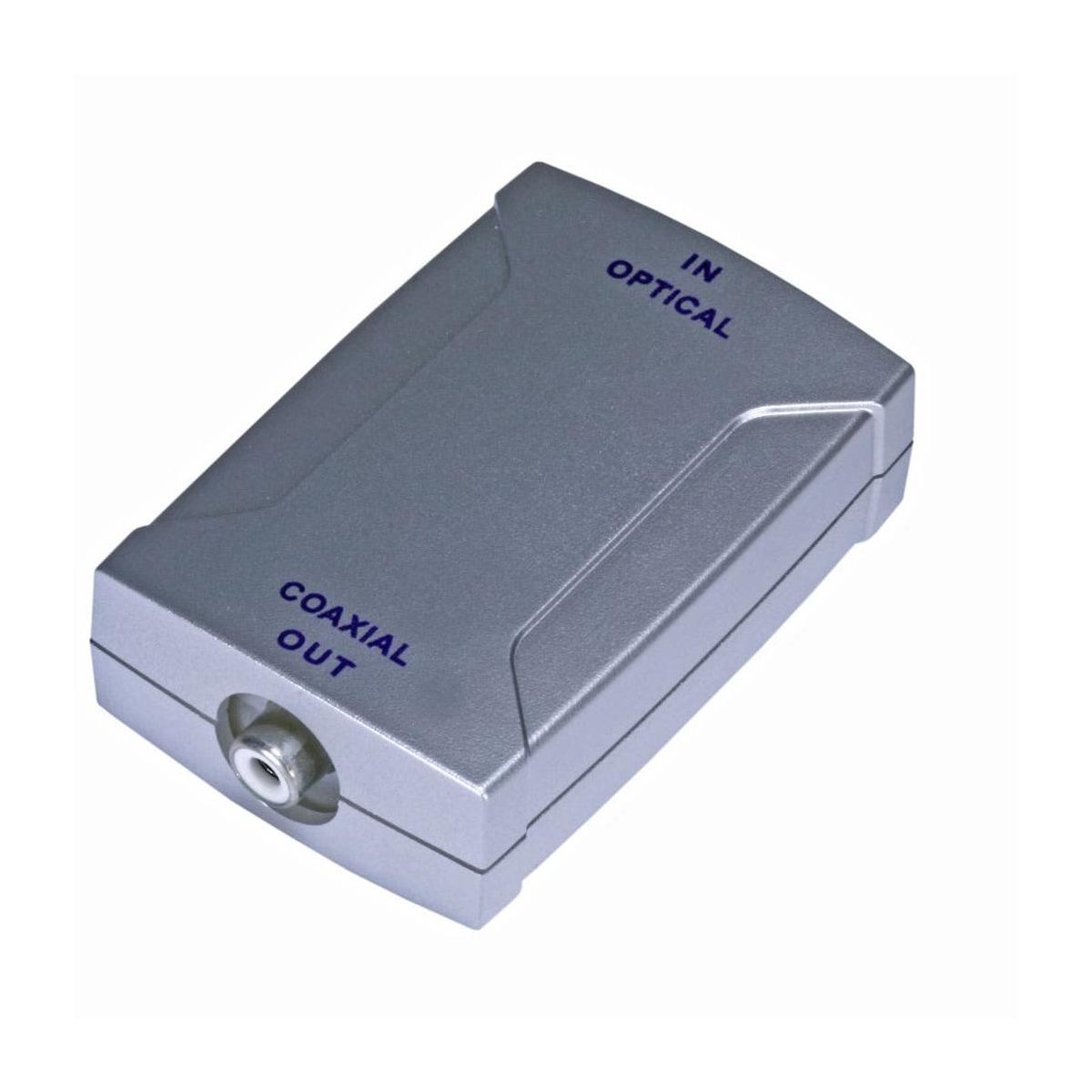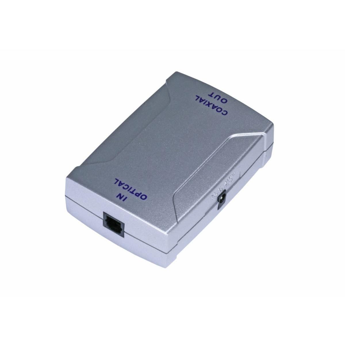 This adapter converts the optical Toslink input signal into an electrical Digital Coaxial output. It has a small footprint, less than 3" x 2", which makes it easy to hide behind your equipment rack. It is powered by an included 6 VDC, 3A AC adapter.