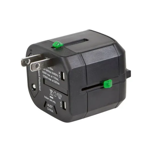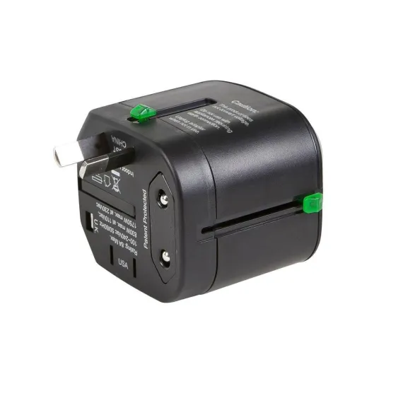 The Compact Cube Universal travel adaptor from Monoprice ensures that you can plug any device into any power socket. This is a blade adaptor in that it allows you to adapt the plug blades of any device to that of the local power wall socket. The face of the adaptor accommodates two- and three-bladed power plugs from the US, UK, EU, Australia, and China. The opposite end has four sets of plug blades corresponding to the four different accepted types (Australia and China use the same plug design). Simply push forward on one of the slides to extend the appropriate plug for the wall socket. This adapter is not UL certified because UL will not certify devices with international power plugs. However, it is CE certified, which is the EU equivalent of a UL certificate. The adaptor is rated for 8amps and can handle 830 watts of power (at 110 VAC) or 1750 watts (at 230 VAC). This adaptor will work with the following plug/socket types: