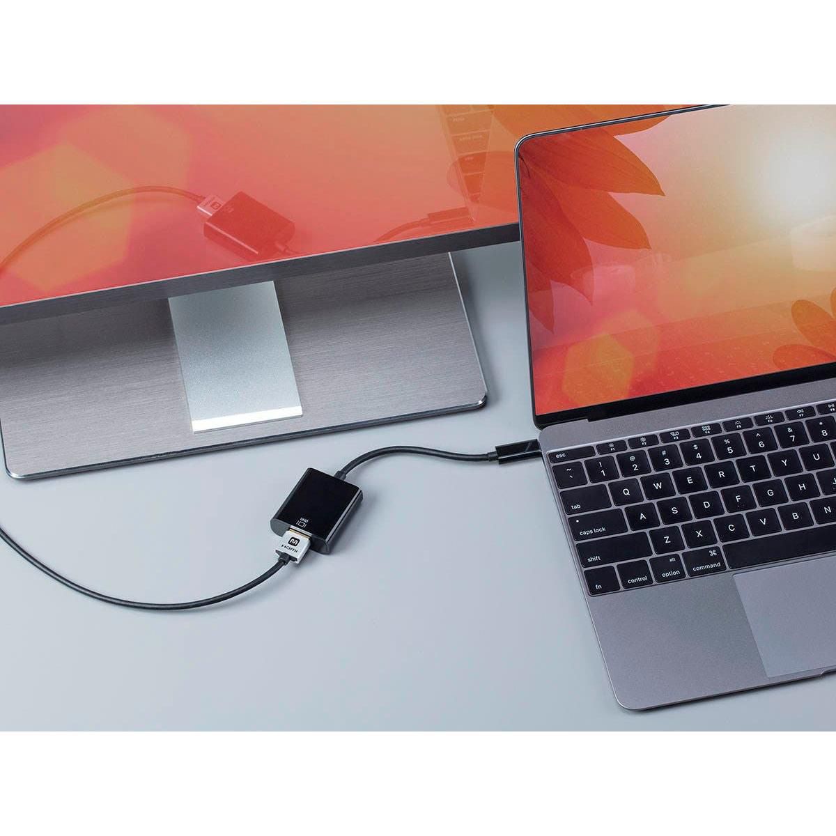 Connect an HDMI display at resolutions up to 3840x2160p @60Hz to mirror your laptop's display or to expand your system's desktop area. This small and portable adapter is easy to pack in your laptop case, so you will always have it at hand, ready for use. This adapter is a true Plug & Play device, with no need for drivers or software installations of any kind. Just plug the reversible USB-C connector into your computer's video output and connect to your HDMI display using a high speed HDMI cable (not included).