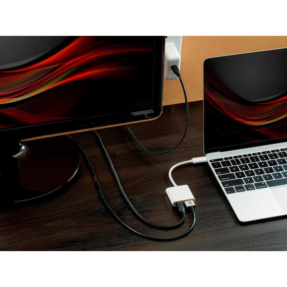 The versatility of the USB-C port means that it can perform several functions, including video output and power input. But what if you need to use a second display for extended periods of time beyond what you can expect from your laptop's battery life? With the select series dual port adapter there is no need to choose between the two! This adapter allows you to connect an HDMI display to mirror your laptop's display or expand your system's desktop area, with support for resolutions up to 3840x2160p @30Hz. It also features a USB-C port, which you can connect to your original USB-C charger, so you can charge the battery while simultaneously using a second display!