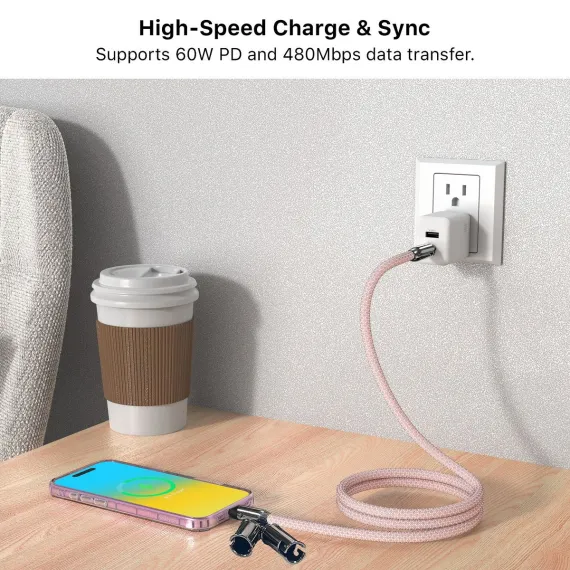Style that connects. Why choose between fashion and function when you can have both The Crossbody Strap + USB-C Charging Cable is more than just a phone strap—it's your on-the-go power source wrapped in a sleek, wearable design. This 55" crossbody lanyard keeps your phone within reach while doubling as a USB-C to USB-C fast charging and data cable, so you're always connected without the clutter. Built for effortless mobility, its braided nylon exterior delivers durability with a luxe touch, while reinforced aluminum connectors ensure a strong, reliable charge. Whether you're running errands, traveling light, or keeping your hands free, this strap powers your day, your style, and your device seamlessly.