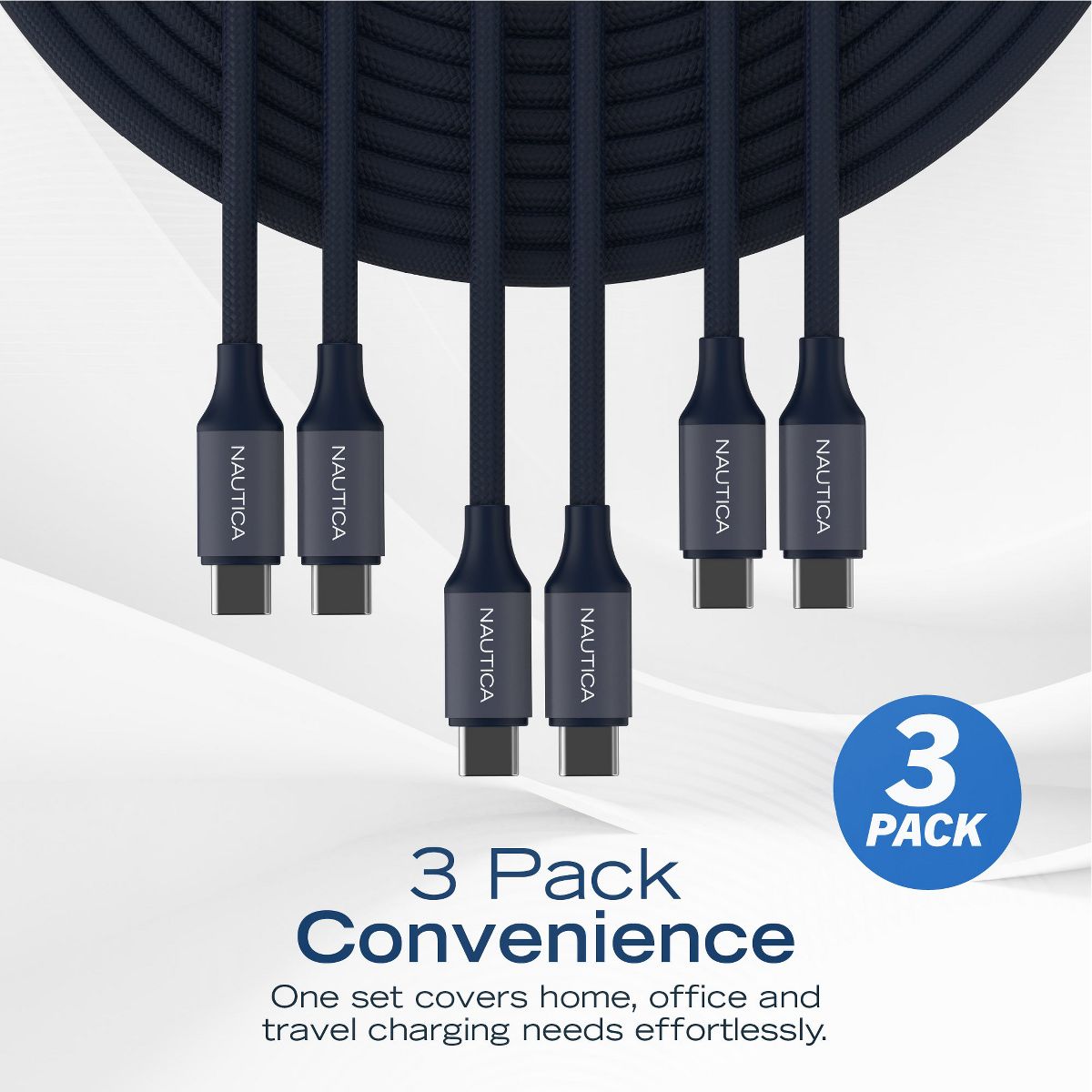 The Nautica Turan CB530 USB C to USB C Cable 60W Fast Charging 3 Pack is designed for powerful charging and reliable data transfer across all your USB C devices. Each cable supports up to 60W Power Delivery with PD input and output, making it suitable for smartphones, tablets and compatible laptops. This set includes three 4 foot braided USB C to USB C cables built with premium materials and reinforced connectors for long lasting durability. The braided fabric exterior helps resist daily wear, bending and tangling while maintaining consistent performance. In addition to fast charging, the cables support data transfer speeds up to 480 Mbps, allowing efficient syncing between devices. Compatible with iPhone 17, iPhone 16, iPhone 15 and iPhone 14 series, Samsung Galaxy S25 and S24 series, Google Pixel devices, iPad Pro, iPad Air, MacBook Air, MacBook Pro, Chromebooks and other USB C enabled laptops and tablets. The Nautica Turan CB530 cable bundle delivers a balanced combination of speed, durability and everyday convenience for all your charging needs.