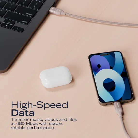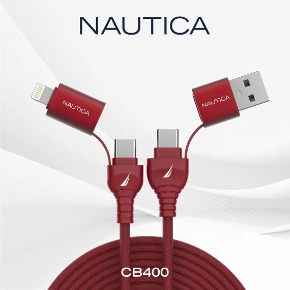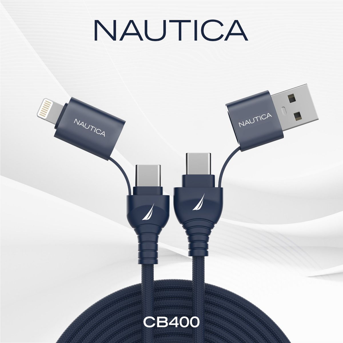 The Nautica CB405 is the ultimate all-in-one charging and syncing solution. This MFi certified 4-in-1 cable combines USB-C, USB-A to Lightning, and Type-C PD support in one sleek, compact design. No more carrying multiple cables, charge your phone, tablet, laptop, and wireless earbuds with just one cable. With a maximum power delivery of 100W*, the CB405 ensures fast and efficient charging for all your devices. Made with a durable woven fabric cover and high-quality aluminum connectors, this cable is built to last while staying stylish. Say goodbye to clutter and hello to convenience with the Nautica CB405, the only cable you’ll ever need for all your charging needs. Note: Only one device can be charged at a time using the Type-C, USB-A to Lightning port, or Type-C PD.