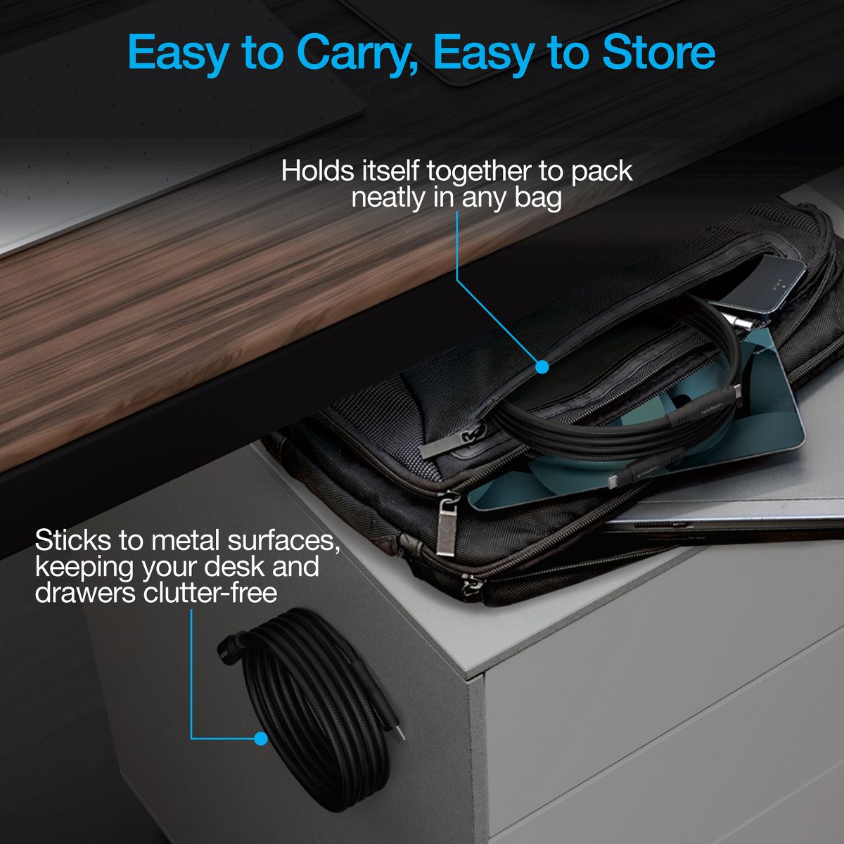 Tidy charging – without the twist. The REcoil cable from Naztech® is the first-of-its-kind magnetic USB-C® cable that stays coiled where you want it and lays flat where you need it. Featuring a full-length magnetic design, the entire cable sticks together and keeps itself coiled, organized, and tangle-free in your bag, in your car, on your desk, or in your drawer – you can even stick it to the side of your metal filing cabinet to keep your desk and drawer nice and clean. And when it’s time to plug in, this uniquely ultra-soft and ultra-flexible magnetic cable lays flat from end to end so it won’t clutter your space trying to twist and coil itself up while you charge. It supports up to 100 watts of USB-C® Power Delivery fast charging for universal compatibility with all USB-C® devices, from laptops and notebooks to tablets, phones, wearables, and more. The cable is made with industrial-strength braided nylon for durability and reliability.