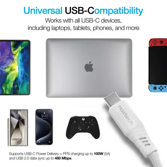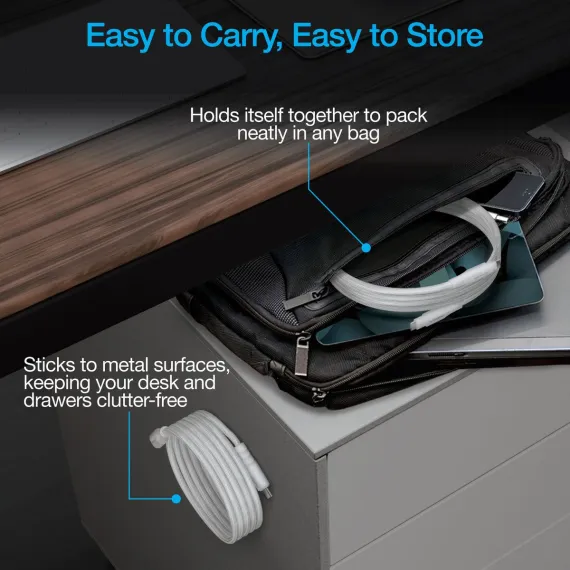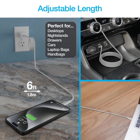 Tidy charging – without the twist. The REcoil cable from Naztech® is the first-of-its-kind magnetic USB-C® cable that stays coiled where you want it and lays flat where you need it. Featuring a full-length magnetic design, the entire cable sticks together and keeps itself coiled, organized, and tangle-free in your bag, in your car, on your desk, or in your drawer – you can even stick it to the side of your metal filing cabinet to keep your desk and drawer nice and clean. And when it’s time to plug in, this uniquely ultra-soft and ultra-flexible magnetic cable lays flat from end to end so it won’t clutter your space trying to twist and coil itself up while you charge. It supports up to 100 watts of USB-C® Power Delivery fast charging for universal compatibility with all USB-C® devices, from laptops and notebooks to tablets, phones, wearables, and more. The cable is made with industrial-strength braided nylon for durability and reliability.