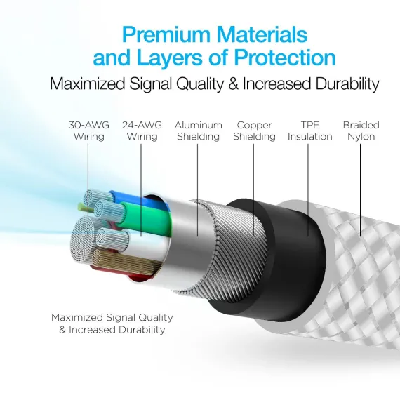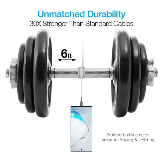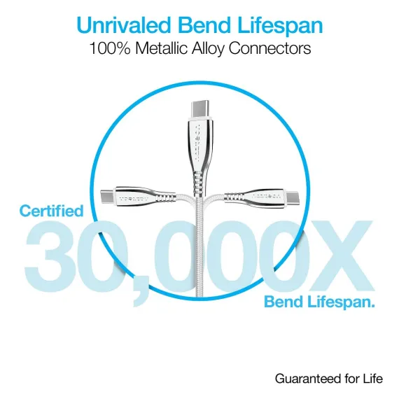 Built with titanium strength! Say goodbye to tangles, frays, splits, and weak connector tips. The Titanium cable withstands active daily use with indestructible ballistic braided nylon and is reinforced with metallic alloy connectors for unmatched durability and incredible high-speed performance. Enjoy an unrivaled 30,000X bend lifespan, making this cable 30X stronger than standard cables. Enhanced with high-purity copper wiring for the fastest data transfer rates and quickest charging times! Take advantage of the fast charge feature on your iPhone by using high-speed USB-C PD chargers to go from 0 to 50% in just 30 minutes! At the perfect length of 6ft, you’ll never have to worry about being close to an outlet waiting for your charge. Upgrade your everyday cable to Titanium!