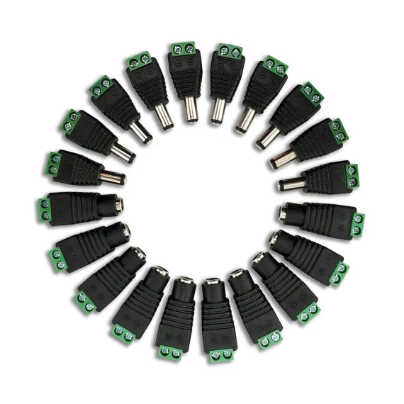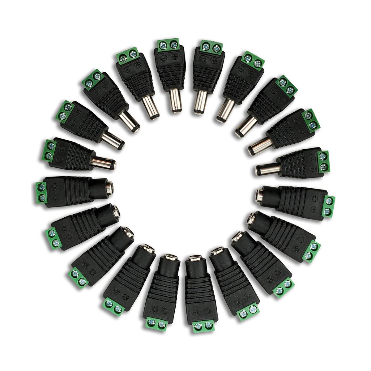 SatelliteSale proudly presents a pack of 10 pairs of Male&Female 12V DC Power Connectors 5.5mm Jack Adapter by SatelliteSale. Meet the reliable fitting with a simple and durable casing. If you need to connect a battery pack or wired power supply to a board that has a DC jack - this adapter will come in very handy! There is a DC connector on one end, and a screw terminal block on the other. Our Premium Quality 12V DC Power Connectors are compatible with 5.5mm barrel jacks that have a 2.1mm center pole, and support power for a wide range of equipment. It can be used in residential and commercial applications for 5V, 12V, 24V, DC Power Supply CCTV Camera Cable, DVR Security System, Led Strip Extension, Video Balun Security Tailgate Camera, DIY Board. These adapters make any installation safe and reliable, while all you need for setting up is a screwdriver to create a solid connection between wired components. The PVC-protected casing is produced for increased durability with stainless screws and sturdy metal connectors. A compact, pocket-size accessory that will come in handy for every technician or DIY homeowner. Every connector we sell is covered with a lifetime warranty to deliver a positive experience to our clients. What is in the box: