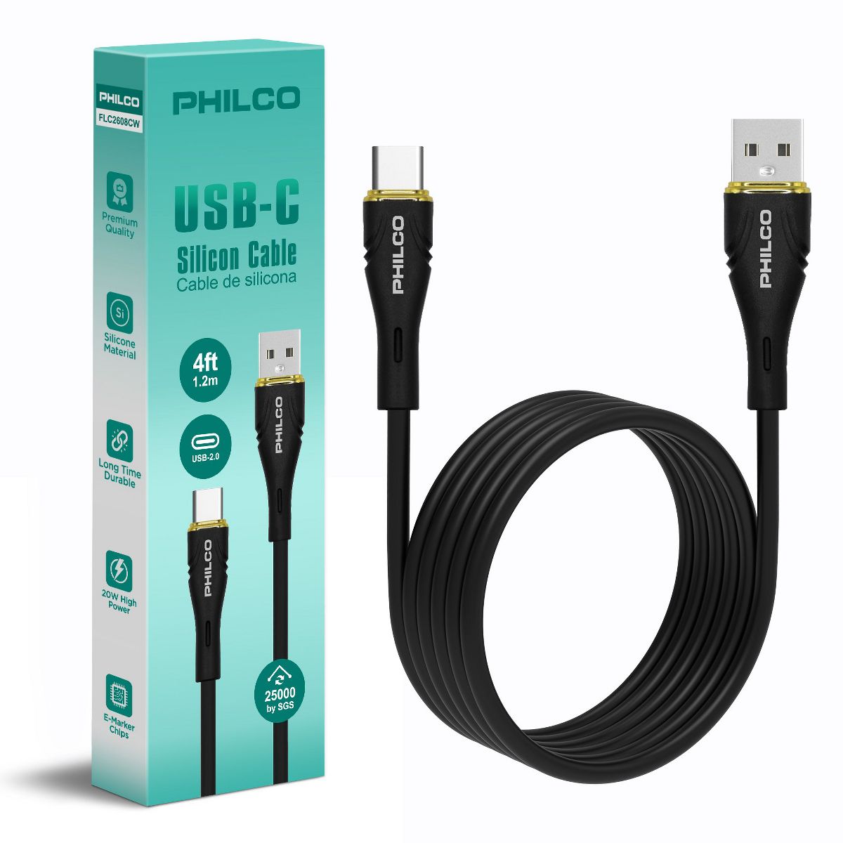 PHILCO USB A To Type C Cable, Silicone, 4Ft Length, 20W Fast Charging, High-Speed Data Transfer, Compatible with USB-C Devices, Tangle-Free, Black