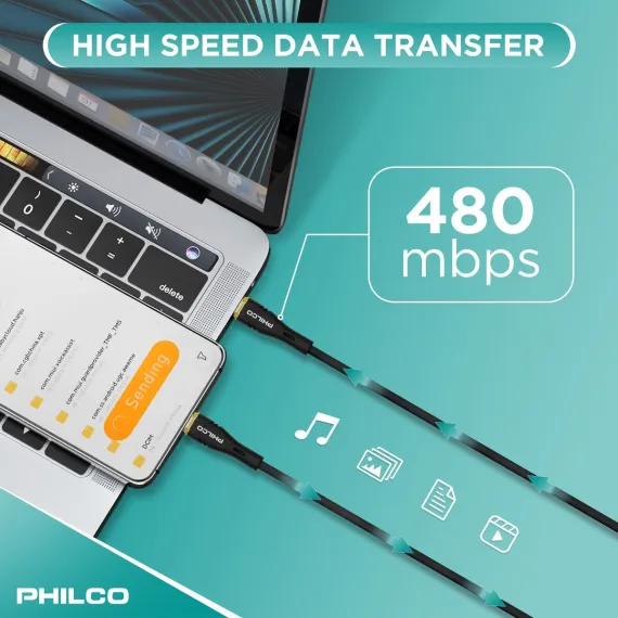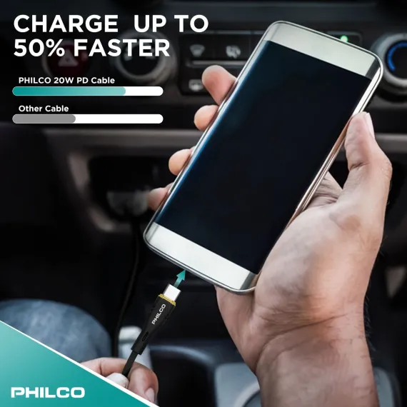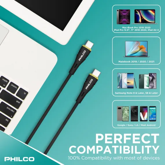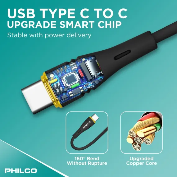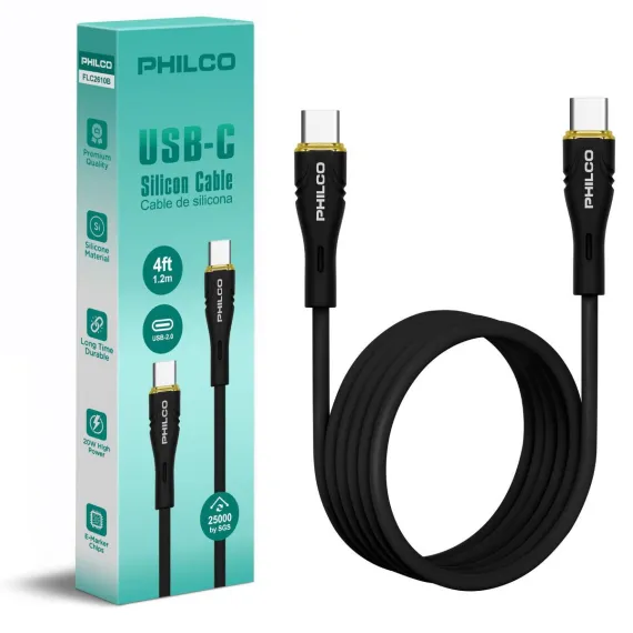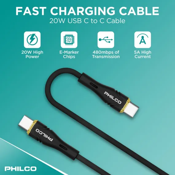 PHILCO USB C to C Cable, 4Ft Length, 20W Fast Charging, High-Speed Data Transfer, Durable and Tangle-Free Black