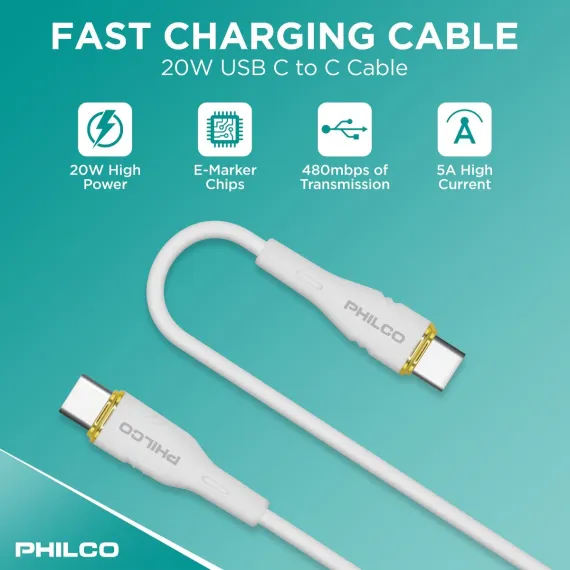 PHILCO USB C to C Cable, 4Ft Length, 20W Fast Charging, High-Speed Data Transfer, Durable and Tangle-Free Black