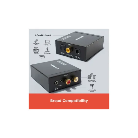 Experience crystal-clear audio reproduction with minimal signal interference, thanks to the optic technology in this digital-to-analog converter, ensuring every note, every beat resonates with the lifelike fidelity you are used to hearing. Whether you're indulging in your favorite music, or listening to an audiobook with friends, this cable delivers an immersive sonic experience that transcends expectations. Its durable construction and strain-relief connectors and box ensure long-lasting performance, while its plug-and-play design allows for easy installation and hassle-free setup. Don’t throw away that old technology. Instead, reintegrate it back into use with this optical to dual RCA audio digital-to-analog converter cable, where precision meets performance and excellence meets enjoyment.