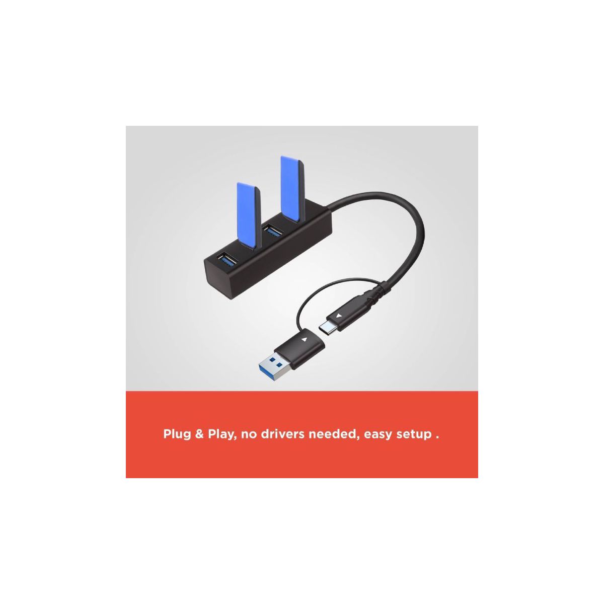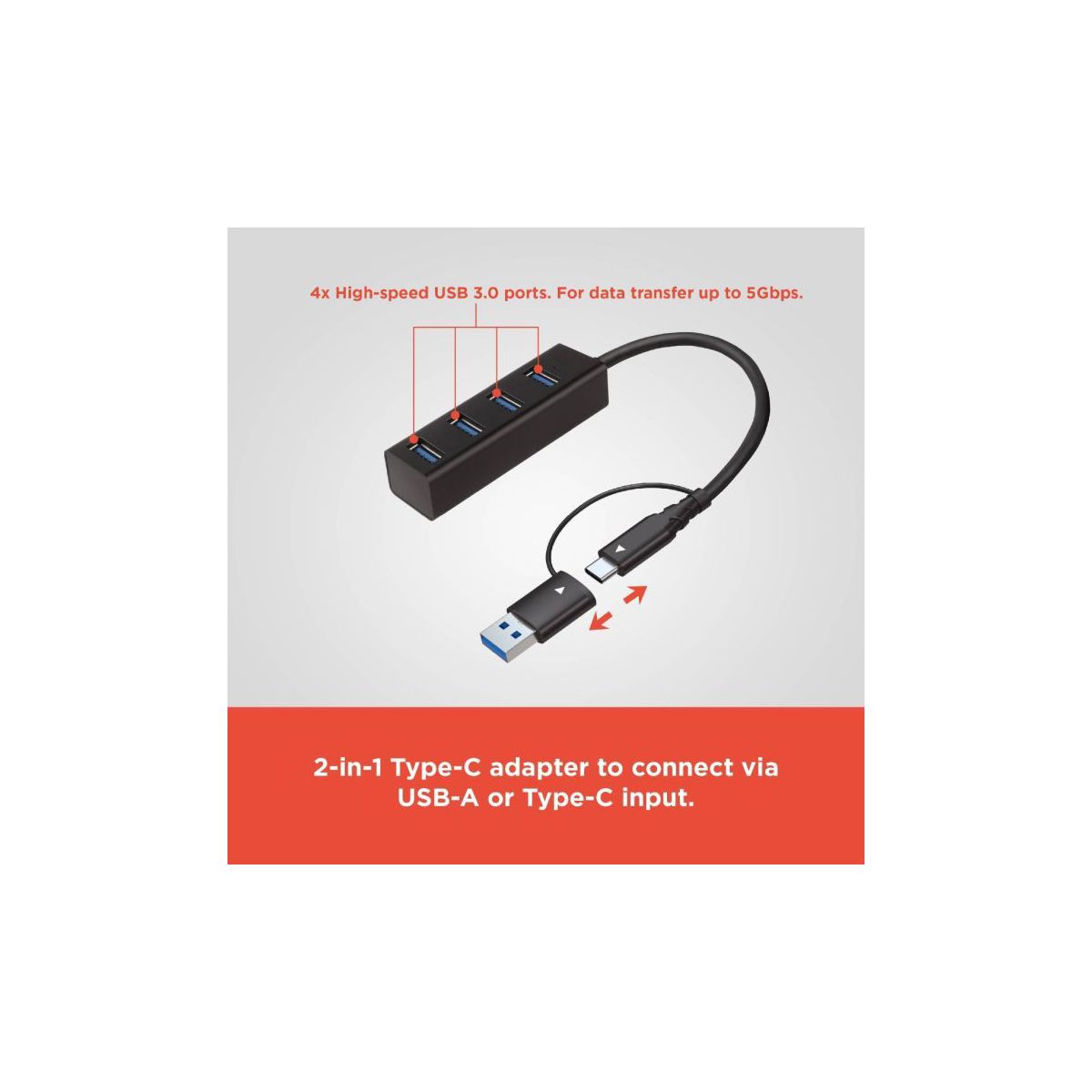 Simplify your workspace and your connectivity with the RadioShack 2-in-1 USB-C to 4-Port USB 3.0 Adapter, an essential tool for multitaskers, professionals, and tech enthusiasts. Built with versatility in mind, this sleek adapter features both USB-C and USB-A 3.0 male inputs, giving you the power to bridge modern laptops and legacy systems with ease. Whether you're managing office files, expanding ports on a compact device, or adding peripherals to your gaming rig, this hub gives you instant access to four USB-A 3.0 ports. Experience data transfer speeds up to 5Gbps, allowing lightning-fast syncing of large media files, documents, and more. The adapter’s solid metal body not only offers a modern, premium look but also enhances durability and heat resistance, making it ideal for daily use at work, school, or on the go. Its compact and lightweight design mean it can slide into your bag without bulk—perfect for hybrid workers or digital nomads. The included 200mm cable offers the reach you need without clutter, making setup clean and simple. Whether you're boosting productivity or streamlining connectivity, this adapter delivers stability, speed, and style in one powerful package. Main Features: Features both USB-C and USB-A 3.0 male inputs, allowing seamless connectivity across modern and legacy devices. Transforms a single port into 4 USB-A 3.0 outputs, perfect for connecting flash drives, keyboards, mice, and other peripherals. Supports USB 3.0 speeds up to 5Gbps—10x faster than USB 2.0—for quick, efficient file sharing and device syncing. Crafted with a premium metal body for enhanced durability, heat dissipation, and long-term performance. Lightweight and travel-ready, with a 200mm cable and slim dimensions to fit any setup with ease.
